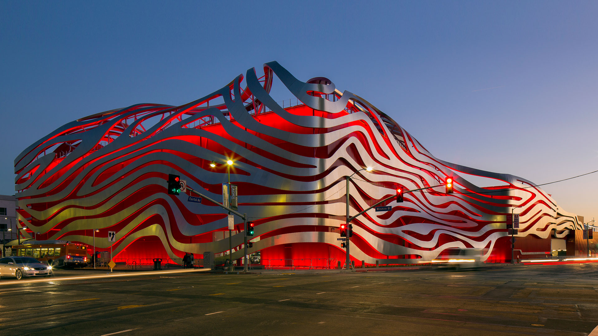 That wild exterior form is built from 308 “ribbon sections,” no two alike, but all gathered to make the building look like it’s about to roll down the street. The ribbons were crafted from 35 tons of textured aluminum, painted “hot rod red.” Even the 140,000 stainless steel screws that hold everything in place were crafted to resemble automobile fasteners. The metal was designed and fabricated in Kansas City and hauled to LA in 60 truckloads.
