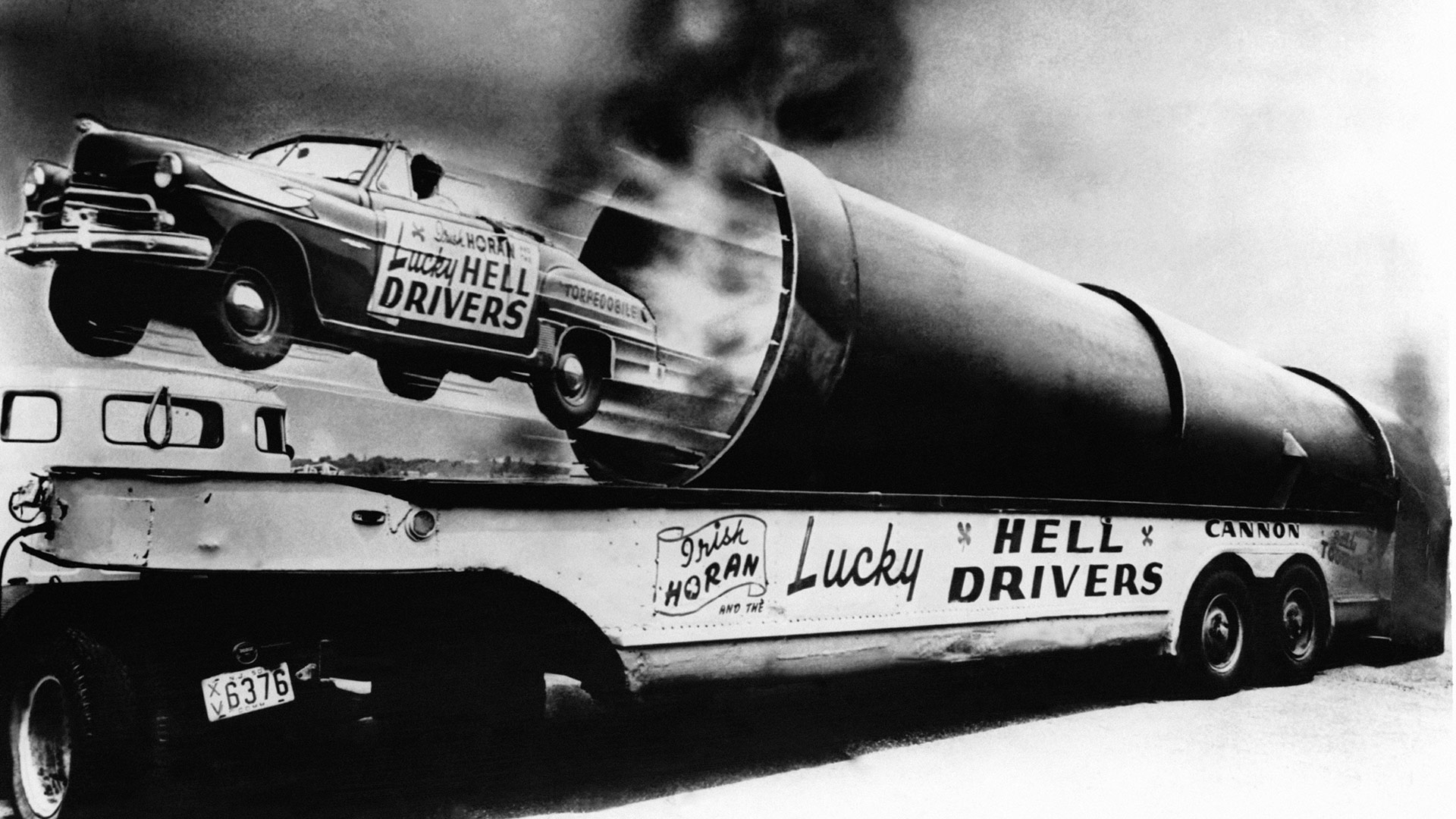 But then, look: It’s a photograph. Yes, the “speed lines” are pure cartoon, though that truck, trailer and barrel (cannon?) look very real. The name “Irish Horan” also rings of historical accuracy: Weren’t the Fifties a time when it was fine to call your Italian friend Federico “Italian Freddy”? There’s even great historical footage of the Lucky Hell Drivers abusing some coupes. They’re doing small jumps, coordinated swerves and doughnuts, but a cannon is nowhere to be seen. Other sources mention the crew jumping buses and crashing, deliberately, but remain silent on the issues of cannons.