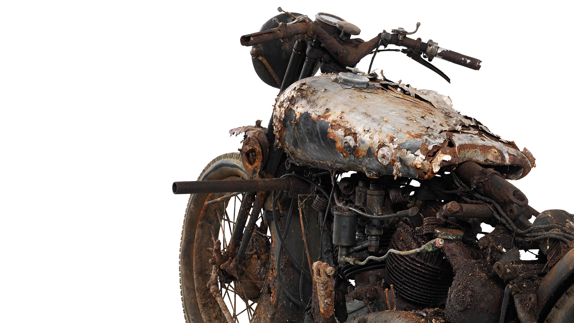 This depository of priceless British steel includes well-rusted examples of Bough’s best and rarest: An Austin-engined, dualie BS4; two decomposing SS100’s; a handful of SS80’s. Were these bikes in perfect shape, this would be the discovery of the century for collectors. Alas, the Broughs are in truly miserable condition and most are unlikely candidates for restoration. Still, they’ll bring good money when they go up for auction at Bonhams in April. Even in a decrepit state, the elegance of a classic shines through.