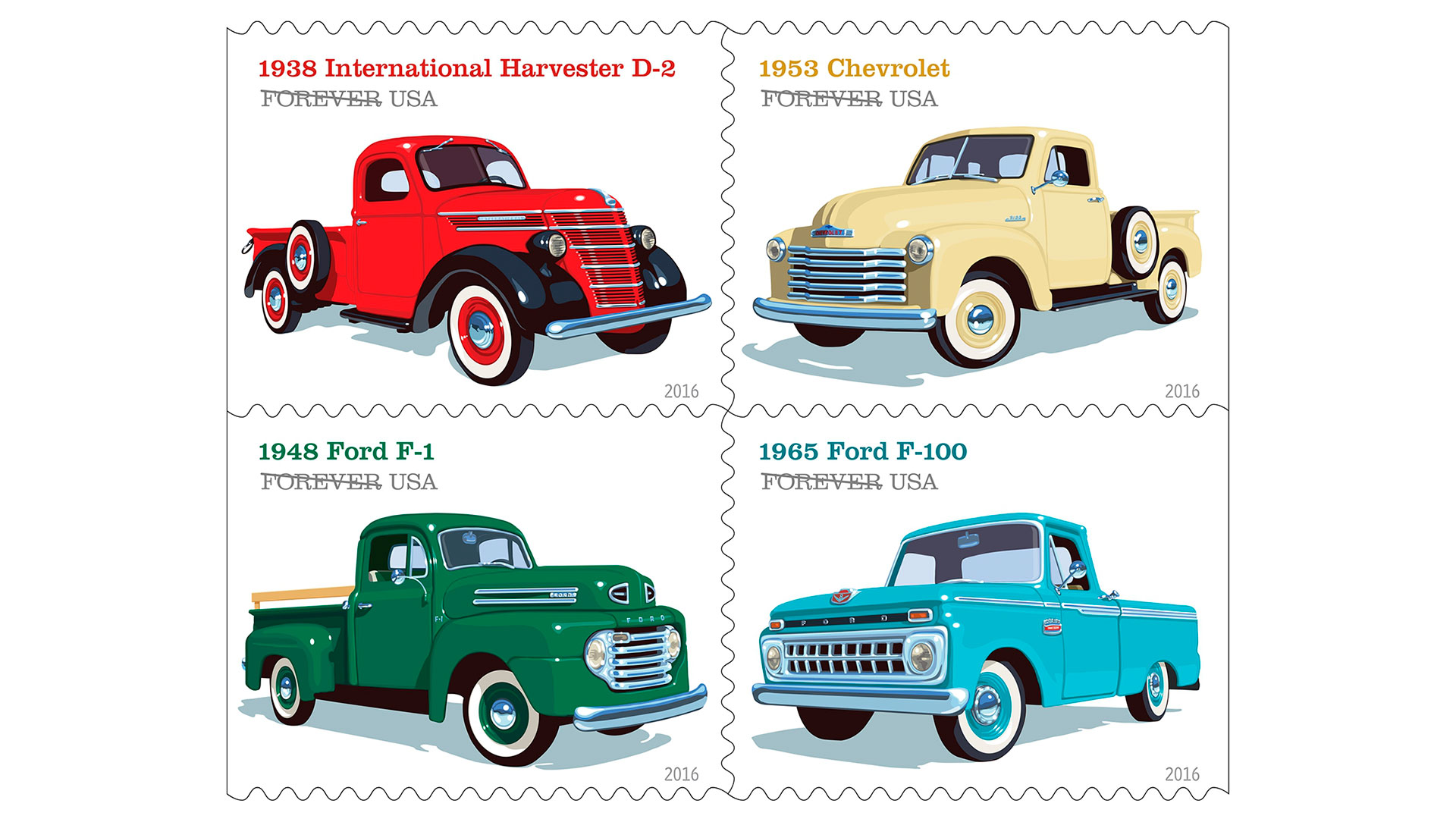 Our only gripe with the new USPS stamps is a conspicuous lack of Dodge, Plymouth, Studebaker, Reo and Jeep. That’s leaving out a huge slice of history. Still, there’s no reason there couldn’t be another series (there’s no release date for these yet, beyond “2016”). We’d add a Dodge Power Wagon, Studebaker half-ton, GMC Caballero and something a little more off the beaten track, like a Hudson.