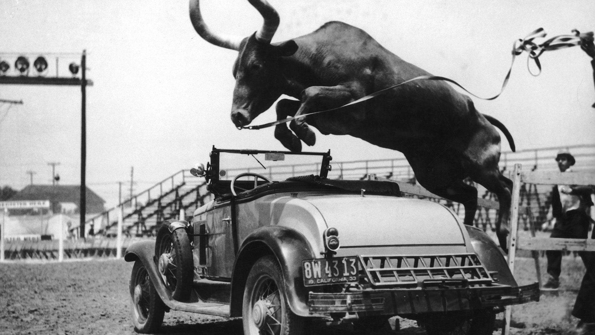 Such rhyming madness must have driven Monty Reger, of Santa Monica, Calif., to train his Texas Longhorn to hurdle. Here, circa-1935 at the Fourth Annual Santa Monica Rodeo, Monty guides his massive bull over an unsuspecting coupe. (The bull’s form, it must be noted, is impeccable.) Like a oversize collie, the bull sails over the car, its grace and menace in perfect union. We hope such a beast jumped for many years, until at which point its joints failed him, and he was sautéed.