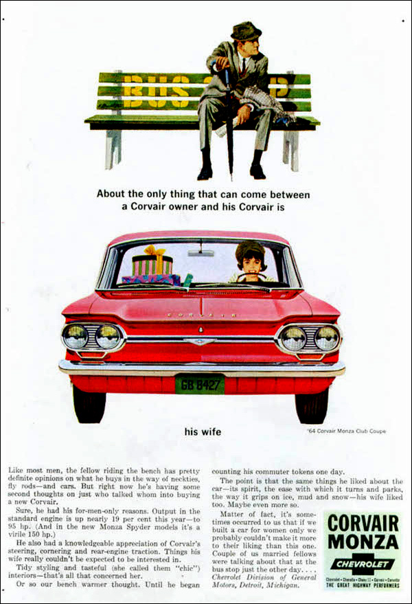 As far as sexist car ads go, this has a shabby charm. While it still operates essentially within the bounds of sexist tropes (men are solid, rational and intellectual, with minds for mechanisms and numbers; women like shopping), the featured heroine is leveraging her disenfranchisement to steal her husband’s car. Come in like a lamb, all cooing and wooing over the “tidy styling” and “tasteful interiors,” and then, like a lion in an avocado-hued headscarf, use the Corvair’s power, grip and maneuverability to chase down your husband and run him over for being a patronizing, withholding s.o.b. Brava.