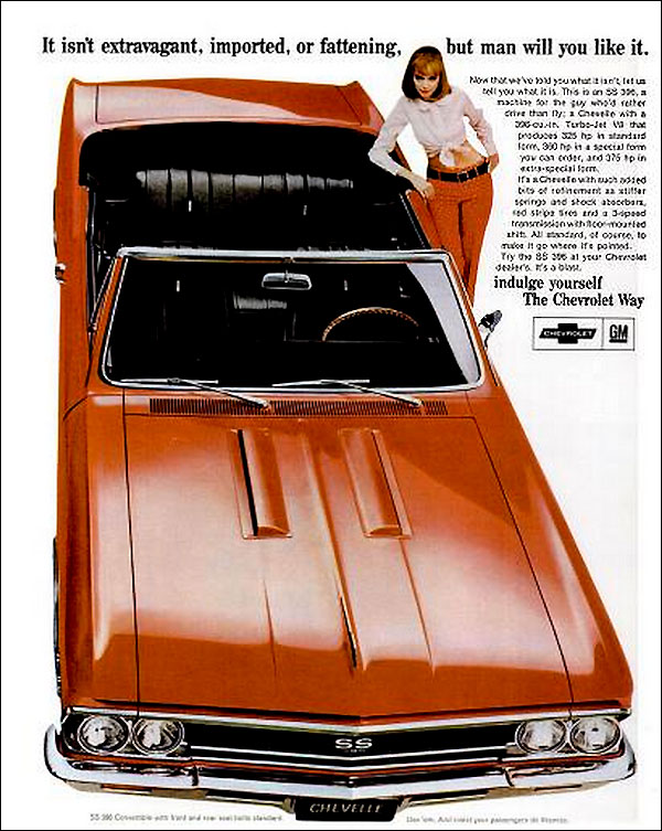 Especially in the Sixties, words like “extravagant” and “fattening” tended to have a chromosomal bias. But the hook here, in an early act of “negging,” all but purrs, “Ladies, we know you’re all just pretentious dieters with Louis XIV tastes.” Perhaps because the concept of advertising a performance car to women was altogether too strange, the writers immediately redirected the copy to a male audience: The Chevelle is for the “guy who’d rather drive than fly.” Female drivers of the Sixties: insulted, then ignored. No wonder the model looks peeved.