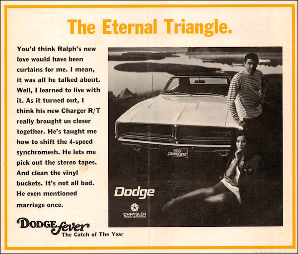 First of all, “Ralph” is sporting a blue-and-white striped mock turtle and a Rock Hudson coif, so any romantic coolness this woman feels should not be taken personally. Yet, Ralph’s 4-speed synchromesh-fondling brand of pre-Stonewall self-repression isn’t the issue. Rather, it’s the female character’s simpering servitude. She’s depicted with a spine as limp as Ralph making an attempt with the lights on. In the language of a long-suffering wife learning to bear the presence of her husband’s mistress, our tragic heroine expresses her new understanding of her place in the “triangle”: She’s around to curate the 8-track, bat at the 4-speed and clean the seats. Tragic heroine: Dump Ralph, get a Beetle and head to California.
