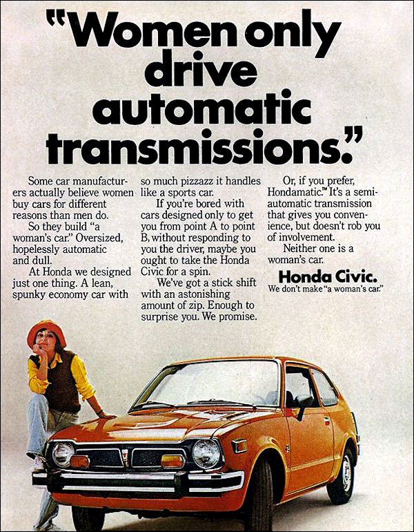 And now, for a lovely respite, a Honda ad based on the simple premise that, hey, women love driving, too. A uterus rarely gets in the way of a snick-snick shift from second to third, and a size 8 women’s is just as adept at pumping the clutch as a 12 men’s. The gendering of cars, like the gendering of soaps, razors, clothes and bathrooms, is altogether pretty arbitrary, so it’s nice to see Honda recognizing as much back in the Seventies. (Maybe the androgyny of David Bowie and Grace Jones jolted the copy writers to attention?) Then as now, pretty much everyone loves a Honda with a manual transmission.
