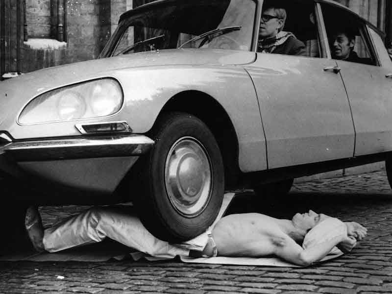 To this day, strong-man stunts—rock-rolling, Boeing 767-pulling, log tossing—are popular, with YouTube around to ensure successful (and, better still, failing) stunts reach millions. But even with those testosterone pyrotechnics in the foreground, there’s a quiet menace to this still black-and-white shot from, of all places, Belgium. Oh, you’re think you’re tough? Here, let me run you over in a French car filled with gourmands addicted to goose paté, camembert and custard. Then we’ll talk.
