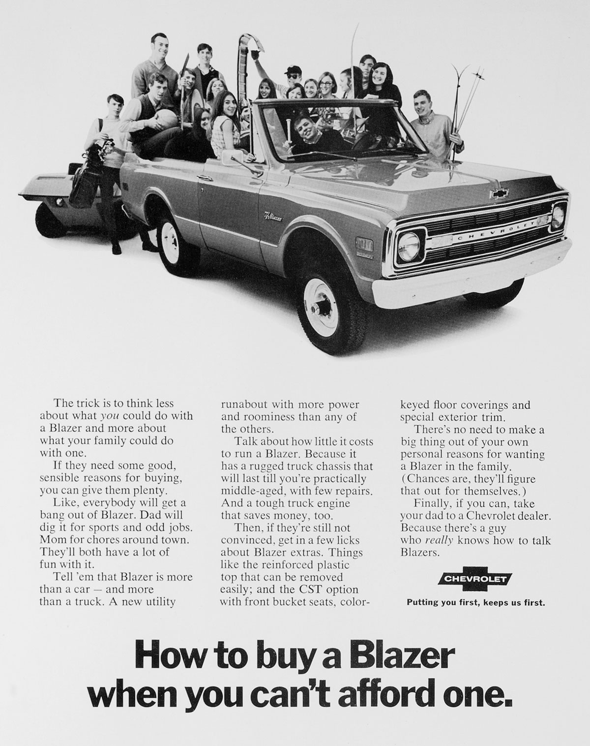 The Bronco was designed to compete with the Jeep. The Blazer was designed to compete with the Bronco, a double one-upmanship which it immediately achieved, crushing it (and all of its other competitors) in sales. The Blazer’s winning attribute? Bigness. “I don’t think people often realize the scale of them until they’re sitting next to a [Jeep] CJ5 or a Bronco. You realize how immensely larger they were,” Ward says.