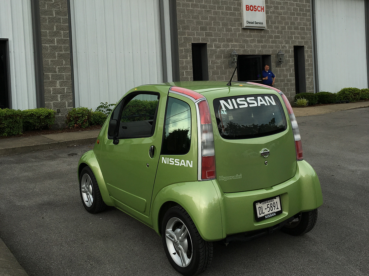 This privileged space was at the Lane Motor Museum, which, in addition to being an irresistible lunatic automotive fantasia, also houses the Nissan USA Heritage collection. The timing was tight, as was my focus, so I skipped taking a spin in the cactus-green 1972 510 Wagon or the black-gold 1980 280ZX 10th Anniversary Edition. Looking for context, and comparison, I focused instead on the pair of electric cars stored there.