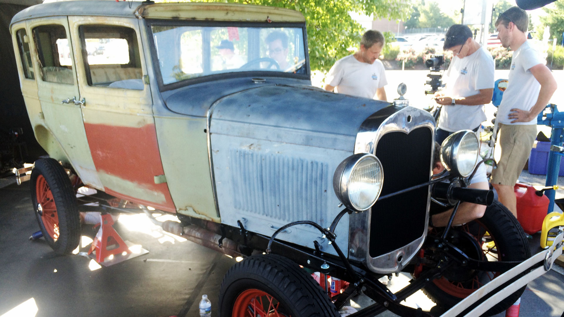 As the four men worked—supported at intervals by other Hagerty employees, friends, and a fan or two—a group of onlookers clotted around the canopy to see how the project was progressing. A man in a Marine Corps hat who seemed to know a lot about the Model A stuck around nearly the entire time, offering bits of useful information and advice here and there. His wife, also a helpful type, even appeared with parts they couldn’t find from time to time (albeit from Hagerty’s own dense pile).