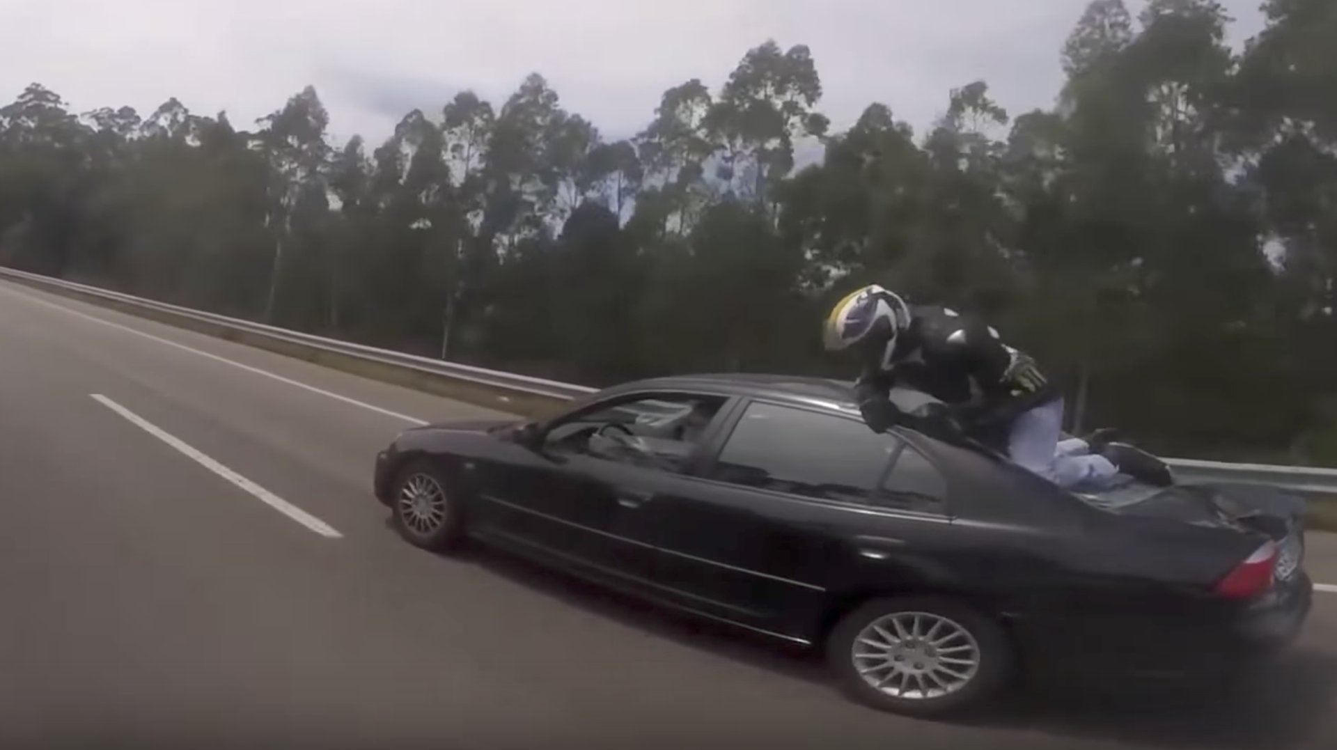 Uploaded to YouTube Wednesday, the video, recorded from the point of view of another bike rider, shows a handful of motorcyclists on a highway in Vila do Conde, Portugal, according to DailyMail. Just seconds into the clip, you can see further down the road that a bike had collided with a car…but when the camera gets closer to the vehicles involved, you can see that the bike rider somehow managed to cling onto the car that he or she collided with instead of going tumbling down the road along with the battered motorcycle.
