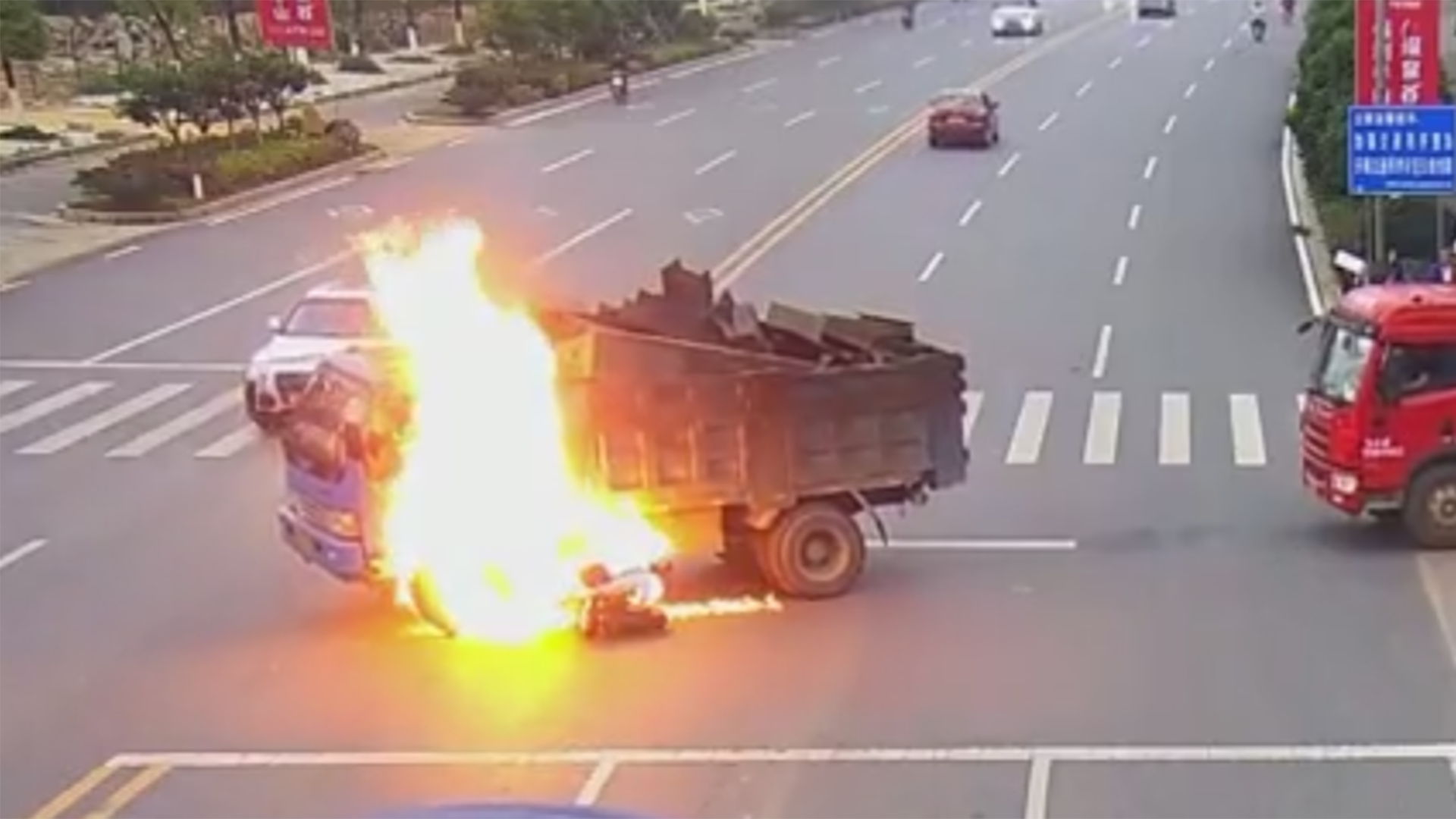 Most low-speed collisions are pretty unremarkable—a dented fender here, a bent bumper there, and generally nothing more than bruised egos all around. But for one unlucky motorcyclist in China this weekend, reality couldn’t have been more different after he crashed into the side of a slow-moving dump truck, striking the fuel tank and setting off a huge explosion almost immediately. It’s only thanks to the quick actions of the truck driver and other bystanders that he was able to survive with non-life-threatening injuries.
