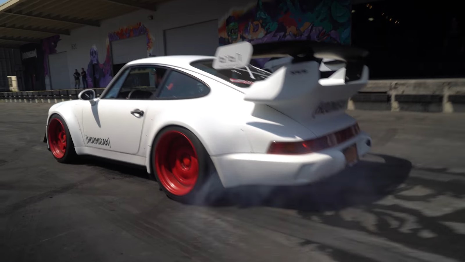 Not only was this car the first RAUH-Welt Begriff Porsche built in the United States, it’s also been treated to a catalog of BBi Autosport parts that make the car an all-around hell-raiser. Built for on-track use, the 965 uses some of the widest Toyo R888R tires known to pavement to fill out the stretched arches. The last thing we thought we’d see is this thing break traction, but with a little help, the guys at Hoonigan got it done.