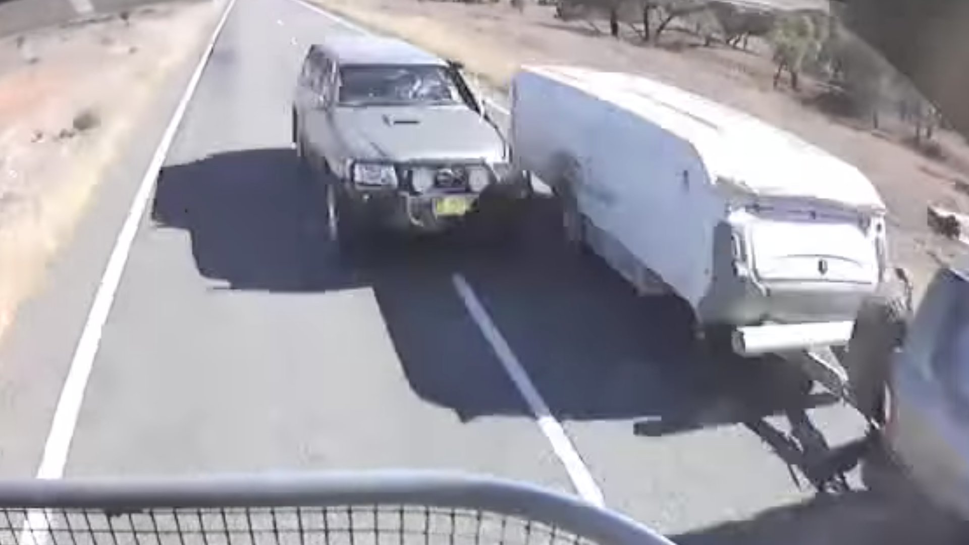Dash cam video shows a driver in Cobar, Australia who apparently decided to dance with death when he or she attempted to pass a car with a trailer on a two-lane road—nearly causing a head-on collision with a 57-ton tractor-trailer road train.