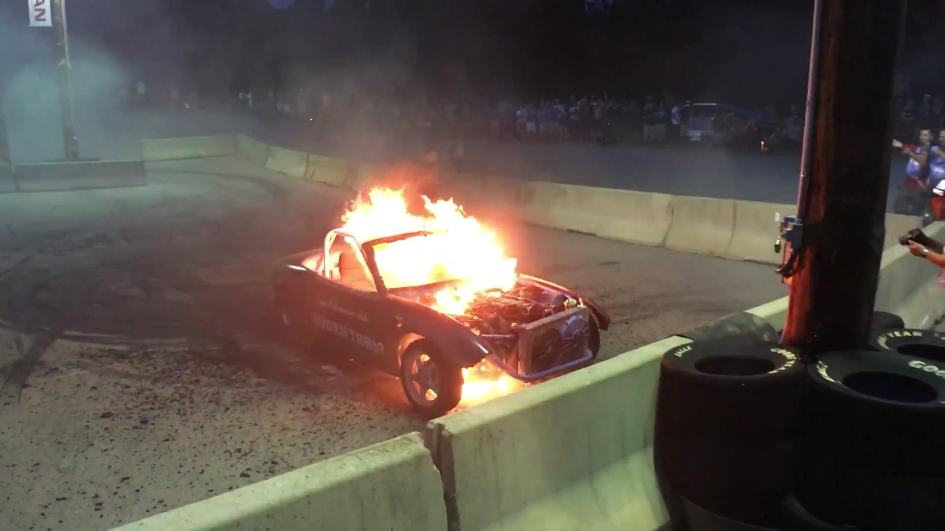 Credit where it’s due, the ensuing burnout is pretty sick…but it’s soon cut short as the transmission gives out with a bang and the little Mazda promptly sets itself ablaze. The real comedic value here, however, is probably the reaction of both HyperFest staff and the burning Miata’s owner.