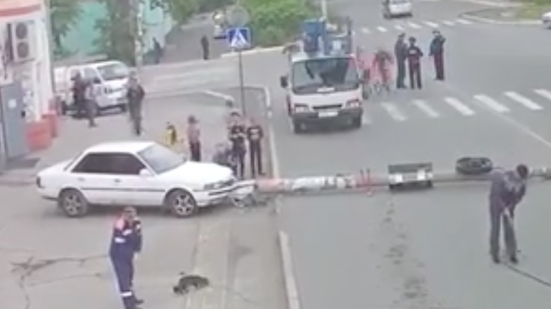 It’s unclear what exactly caused the crash to occur. Somehow, the driver of the white sedan managed to get a hair of oversteer while making a right turn, and from the looks of things, didn’t even try to correct it—instead choosing to whack straight into the problematic object. After colliding with the pole, it fell into the street and supported itself just on the wires it was connected to.