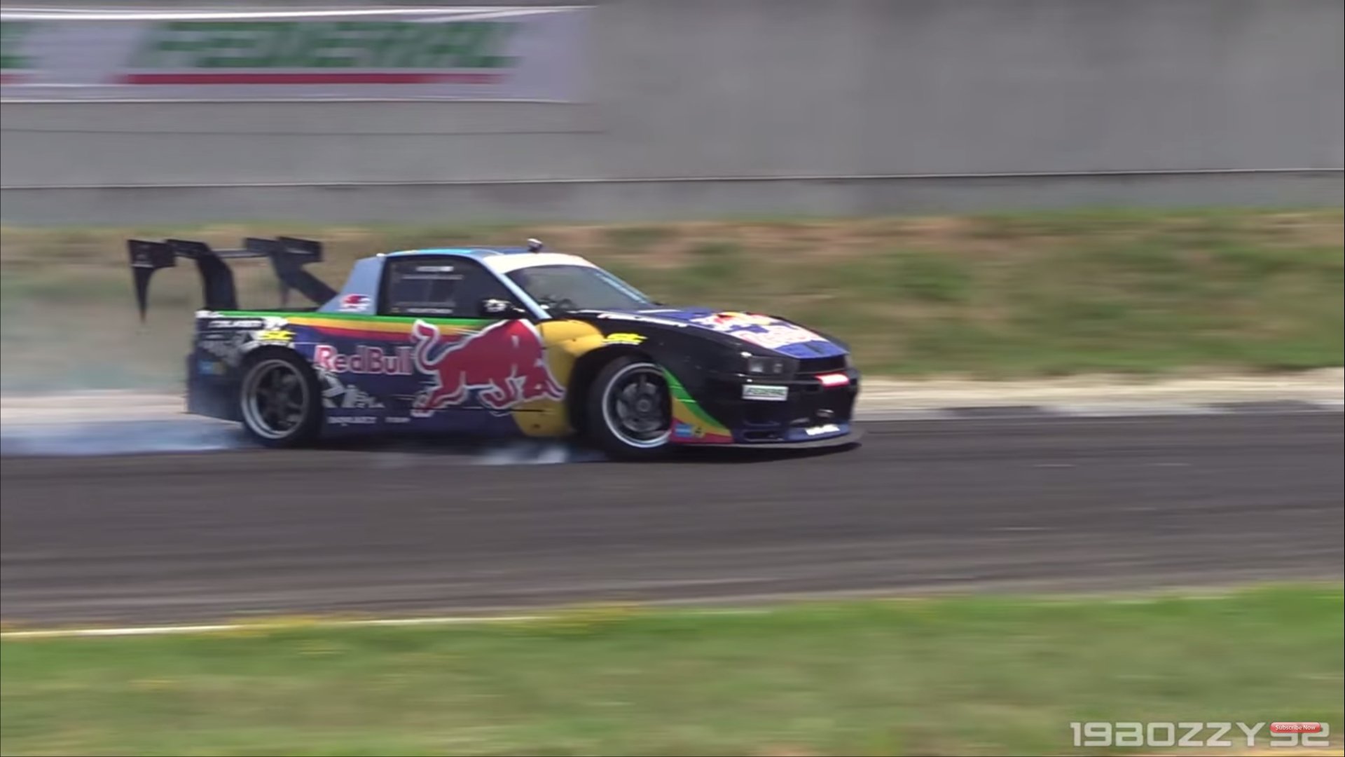 Before the car ever starts its engine in the video below, you’ll note that there isn’t much Nissan left in this 240. It’s been fitted with a Mitsubishi Galant front end and Rocket Bunny body kit, reshaping its original lines to look more like Frankenstein’s monster than the typical hoonmobile. Out back, it’s been chopped and massaged to sport a pickup bed of sorts, mainly to house the monster rear wing that’s been fitted — it’s definitely not one you’d want to get smacked in the face with. Needless to say, this is another level of custom that’s unique to the drift community.