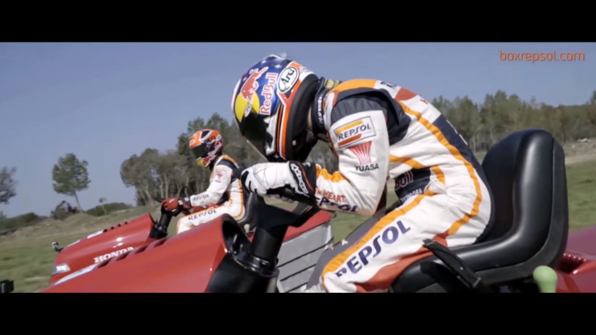 When you see slow-motion video of guys putting on motorcycle racing gear, you know you’re about to see something exciting. After the gloves and helmets are on, MotoGP champ Marc Márquez and his Repsol Honda teammate Dani Pedrosa exchange intimidating looks before the camera pans out to reveal they’re riding… Honda lawnmowers?