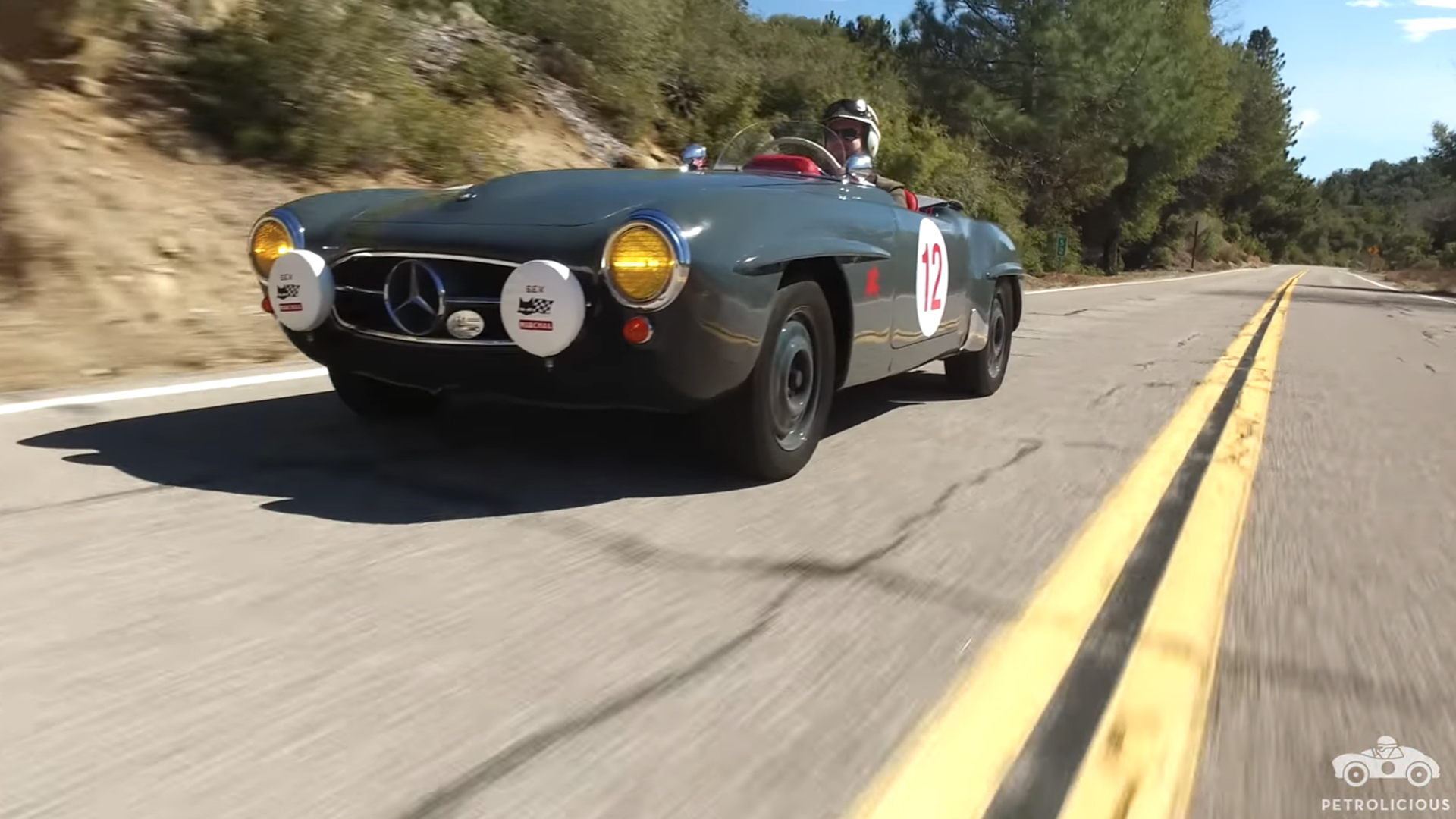 Meet Michael Potiker and his low-slung Mercedes 190 SL roadster, which he has customized to a gorgeous (and mostly period-correct) machine. He aimed for a traditional Southern California cafe-racer theme—fitting, as the video takes place in Los Angeles—based off of the Rennsport kit made available by Mercedes when the car was sold new from the factory. Despite small imperfections, the car is absolutely beautiful. The doors are chopped, the windshield is no more, and Potiker can often be seen sporting a driving helmet and gloves—”like Stirling Moss,” as Potiker describes it.