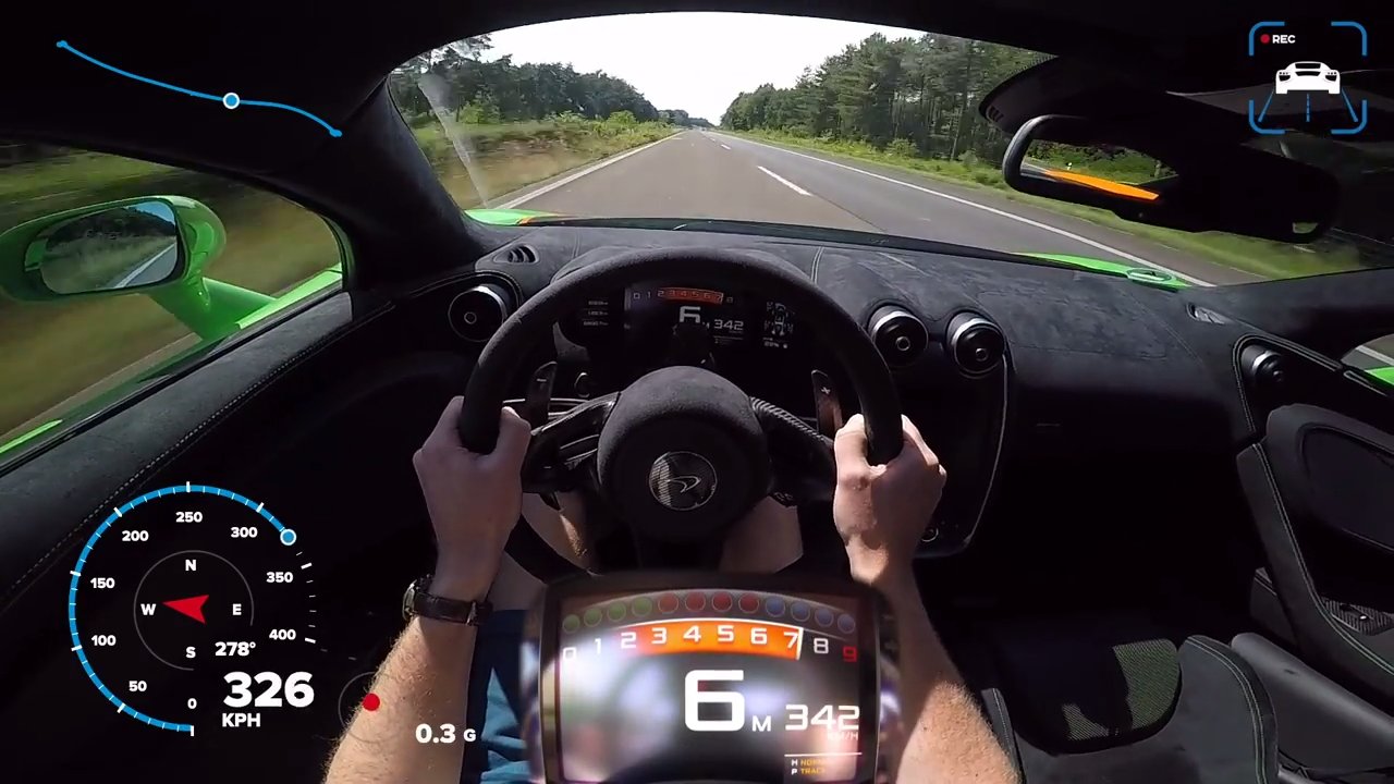From a standing launch on the side of the German Autobahn, he accelerates up through 150 mph in less than ten seconds. The climb from from there to 212 mph is not quite as easy, but the driver lucks out with a clear stretch of straight road and pushes the McLaren 570S right over the limit. Though the on-screen speedometer isn’t calibrated correctly, you can see the “342 KM/H” on the instrument cluster projection at around 2:33.
