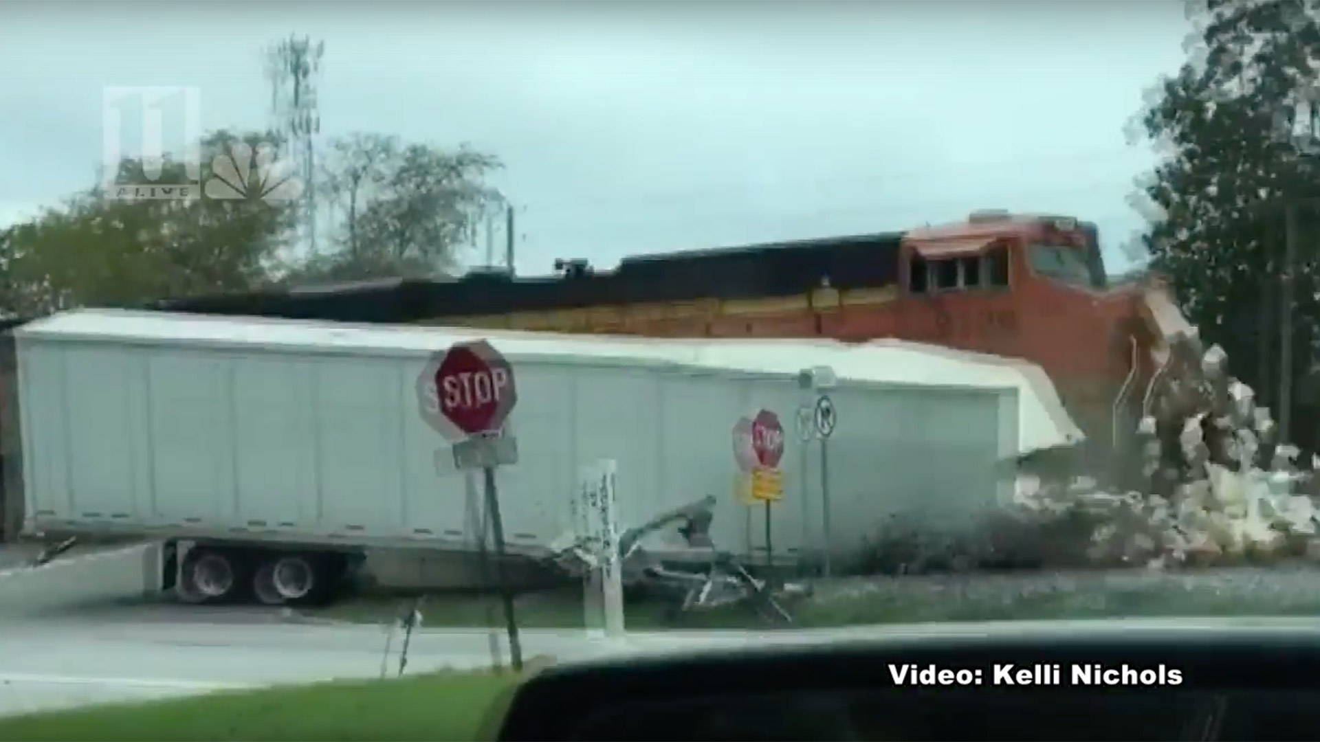 Talk about a sticky situation. A freight train slammed into a tractor-trailer truck that was stuck on the tracks in Locust Grove, Georgia, on Thursday morning, shattering the big rig and sending thousands of bags of candy flying into the air.