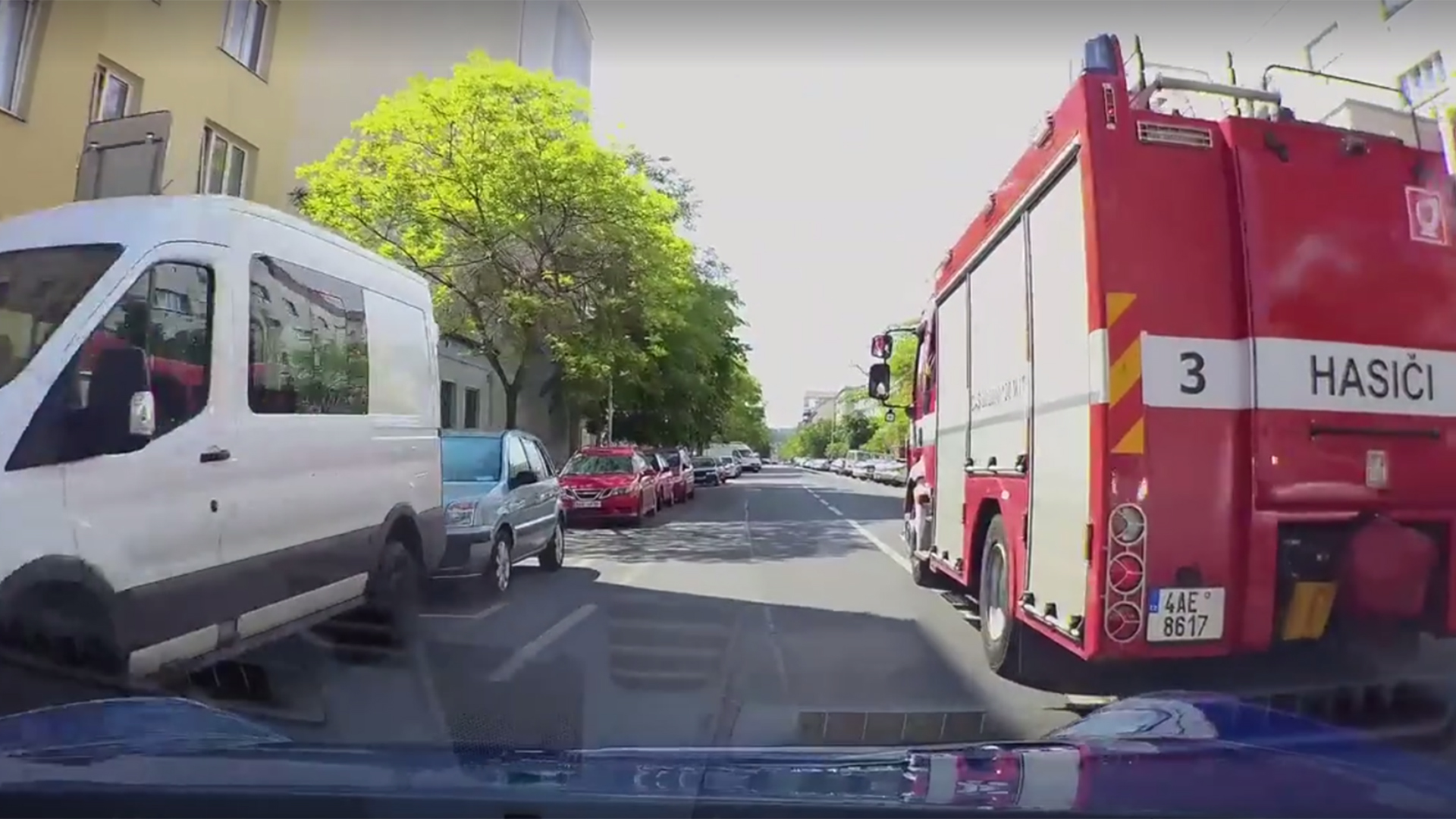 Video shared to YouTube shows a Porsche driver in Prague overtaking a firetruck after clearing an intersection, and the firemen were not too happy about it.