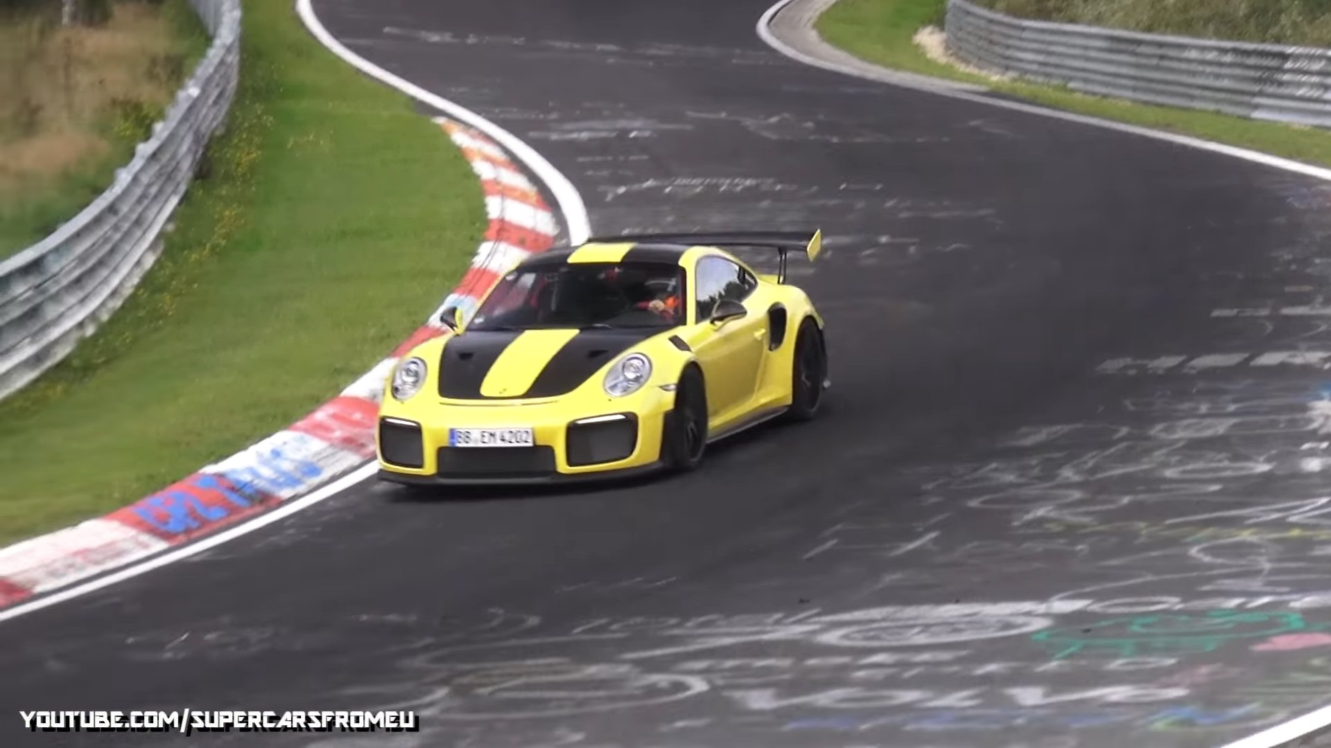 Nurburgring car-spotting channel Supercarsfromeu caught the $293,000 911 GT2 RS hot-lapping the Nordschleife circuit last week, well before the car releases early next year. We’re treated to not one but two of the pre-production cars ripping around the graffiti-speckled track, including a yellow GT2 RS equipped with the $31,000 Weissach package. We also get a sneak peek of the GT2 RS’ addicting exhaust note, thanks in part to its turbocharged 3.8-liter engine sourced from the 911 Turbo S.