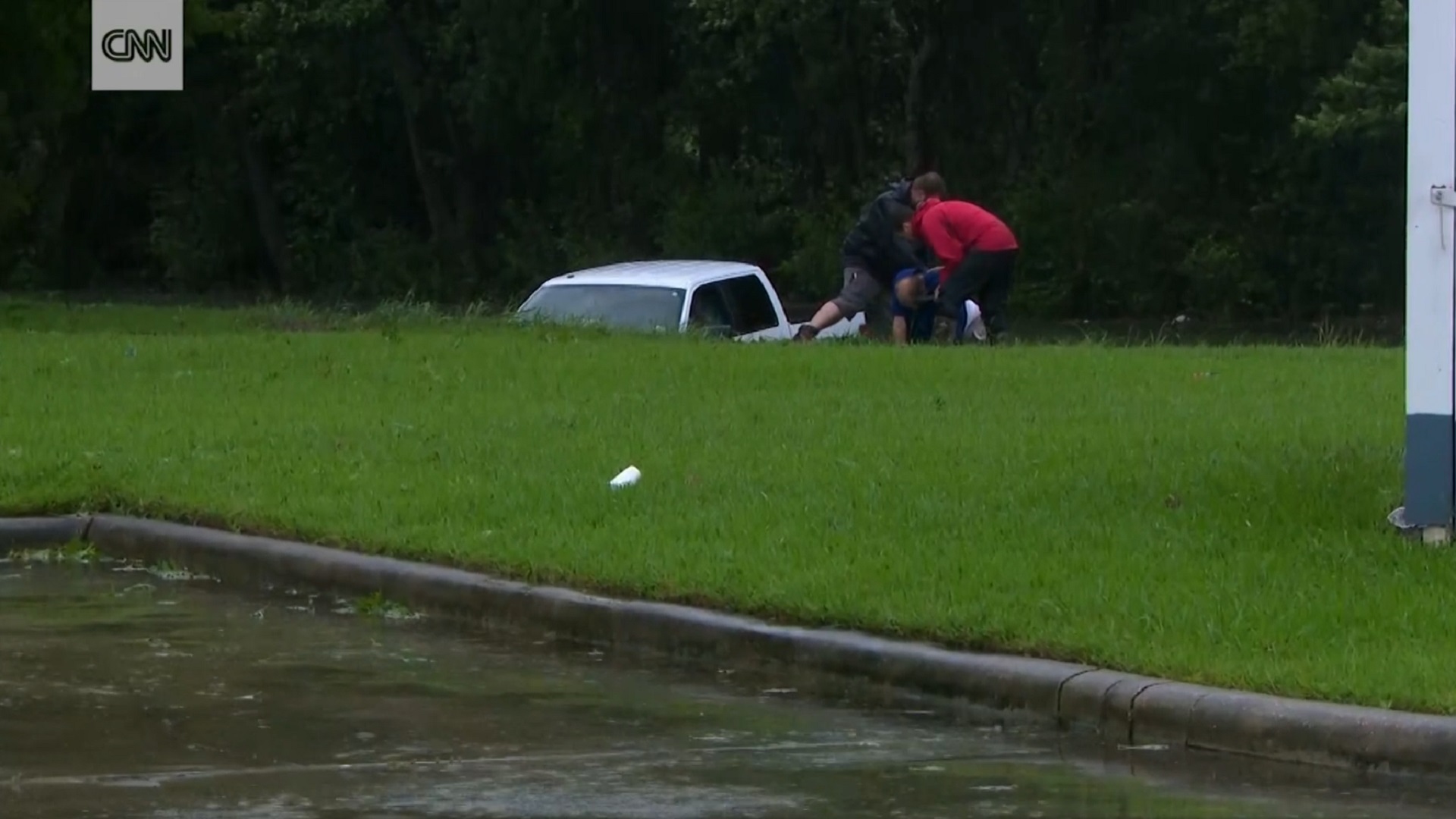 Brandi Smith is not the only journalist turned rescuer in Texas. On Wednesday, in Beaumont, CNN’s Drew Griffin was reporting about the flooding when a man in a Ford F-150 drove straight into a flooded ravine behind him, which is something you should never do. Griffin and one of his crew ditched the live broadcast, ran to the truck, and pulled the driver up to safety on the shore.
