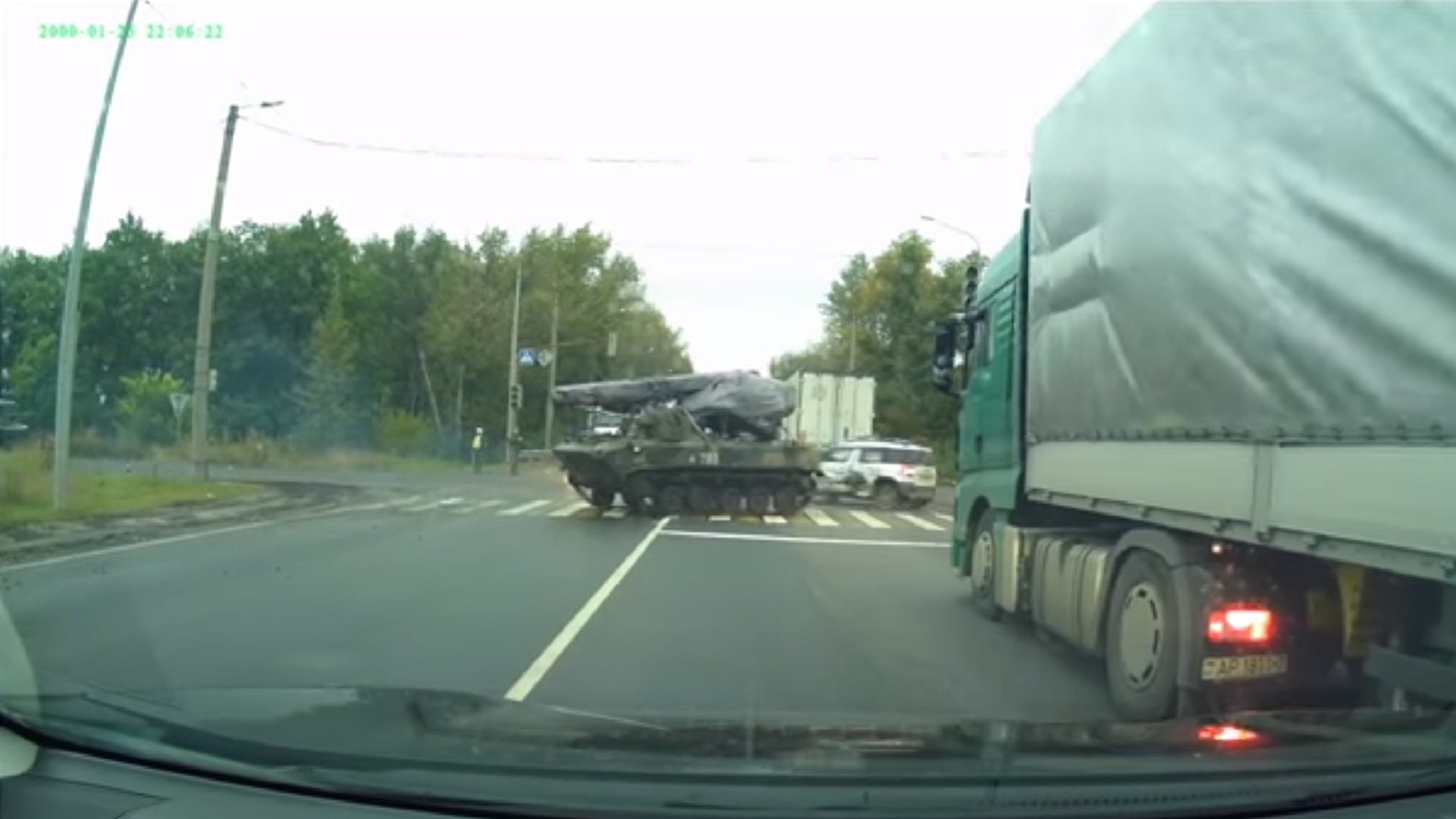 The clip shows a convoy of tank-treaded armored transports carefully making their way through an intersection and down the shoulder of the road. Carefully, that is, until one of them makes the turn a bit too fast. The video description says it “lost control,” but it looks like it accelerated forward instead of making the tight turn to remain on the shoulder, putting it into the middle of the road. To compensate, the driver puts the vehicle into a four-wheel two-tread drift, just like Han drifting his Mazda RX-7 in circles around two pretty girls in a Nissan Skyline. Unfortunately, unlike Han, the heavy military vehicle slides wide, smashing the Skoda that attempts to avoid the Russian drift shenanigans. The Skoda is spun sideways, and its side impact airbags go off. Fellow motorists run over to the Skoda to help. The video ends before it’s clear if the Skoda’s occupants were hurt or not.