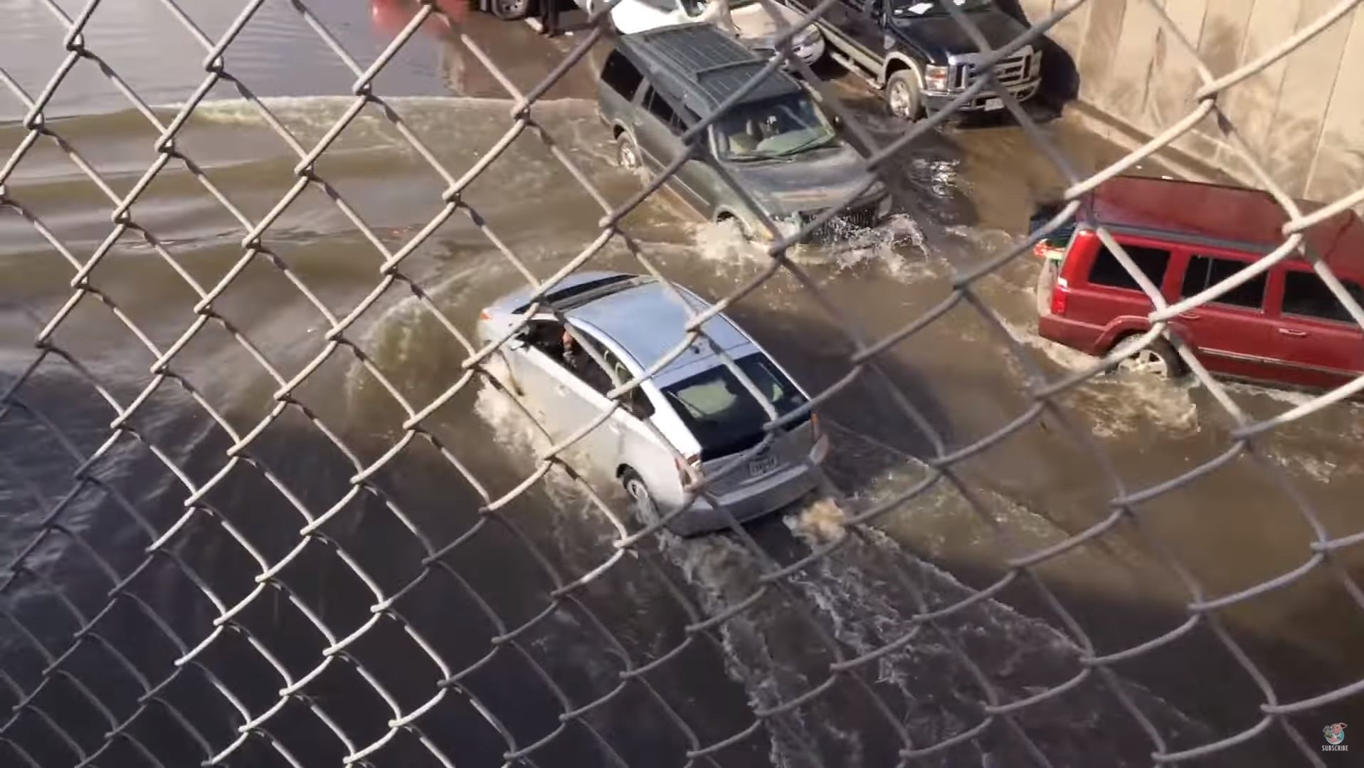 This footage is from a Houston flood back in May of 2015, but it was just shared by YouTube channel ViralHog. The video shows us a very normal looking gray Toyota Prius filmed from an overpass above a nasty flood. The Prius drives through flood water going almost all the way to the top of the wheel wells. The water is so high, the Prius makes a wake like a boat cruising on a lake splashing a few bystanders not brave enough to drive through the flood.