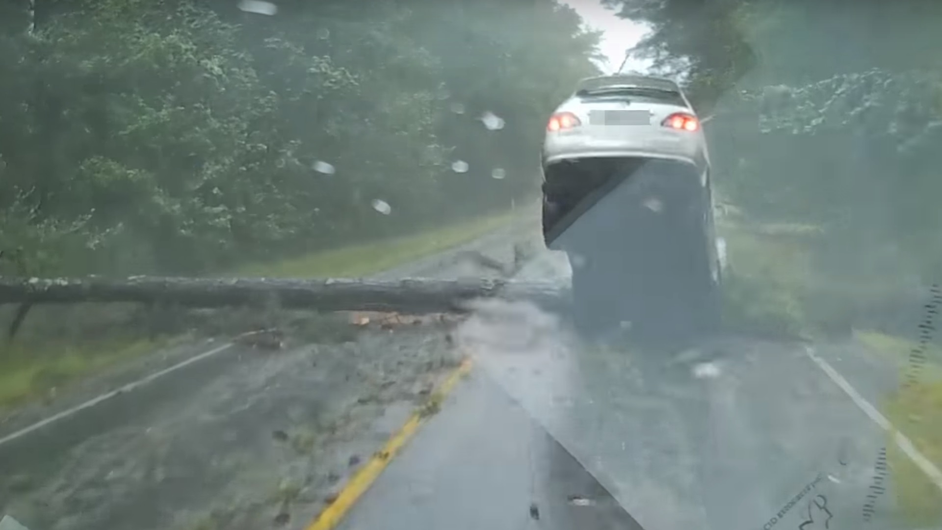 A man driving behind her happened to have a dash cam, and the video shows her Lexus RX cruising along at a decent clip amid the rain and wind. Suddenly, a tree that appears to be at least 50 feet tall comes crashing down from the left. Baxter slams on the brakes, but she’s unable to stop in time and strikes the trunk just as it hits the roadway, crushing the front of her car and sending the rear end spiking into the air.