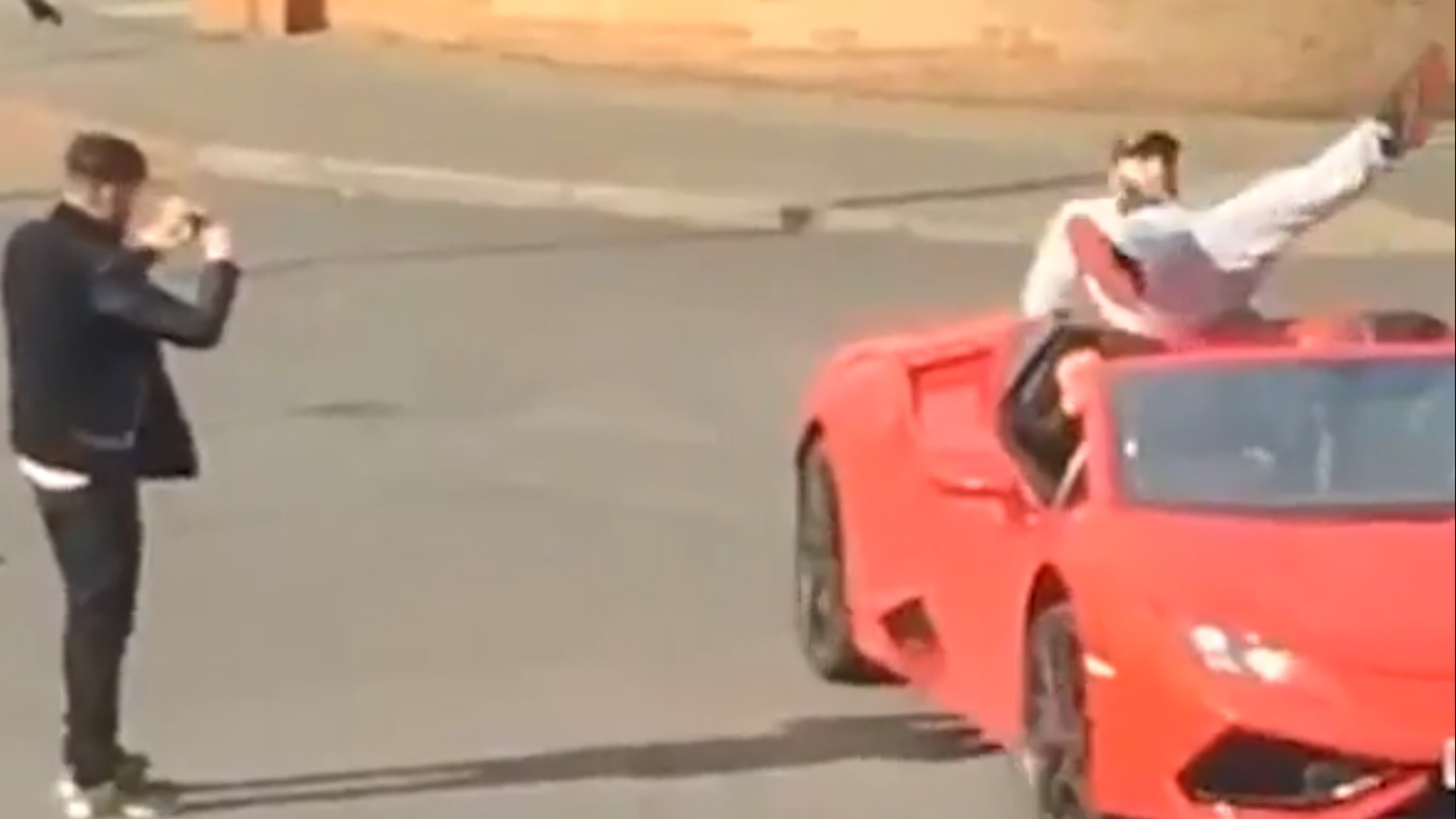 That proved to be a prescient observation a few minutes later. As the rapper sat on the Lamborghini’s rear deck and continued his act, whoever was in the driver’s seat hit the gas a little too hard, sending the poor guy tumbling backwards and landing flat on his back in the parking lot. Ironically, he appears to land in the exact same spot where he was previously sitting, just a few feet lower.