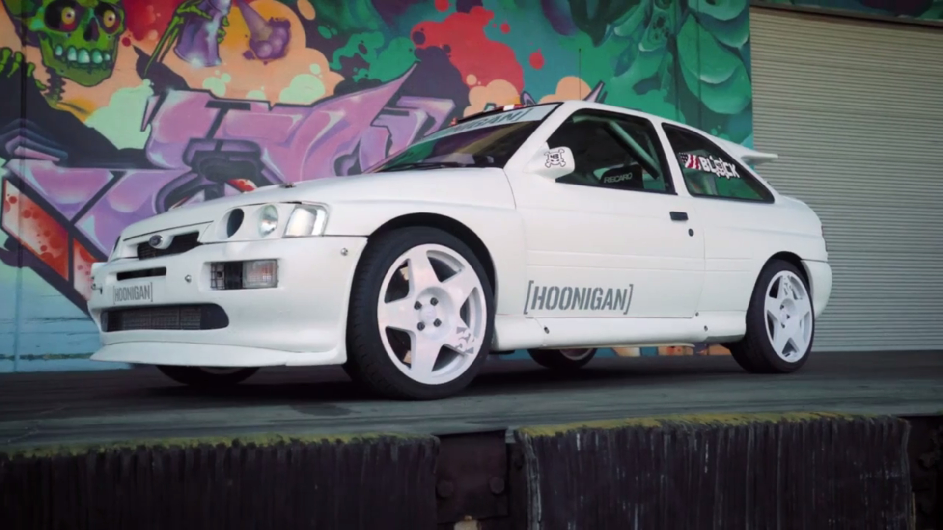 Eventually, Block hops in his Escort rallycar and rips some snappy donuts. Check out the video below and enjoy.