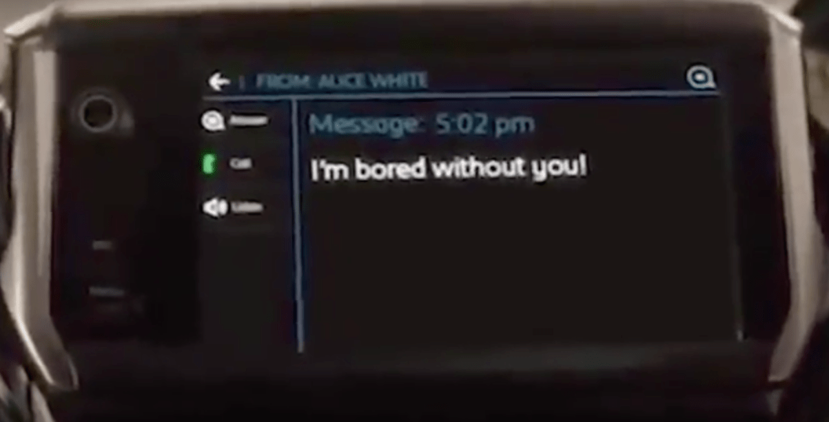 In the ad, a man is shown driving down the road when he receives a text from a woman at a pool party named Alice with the message, “I’m bored without you.”