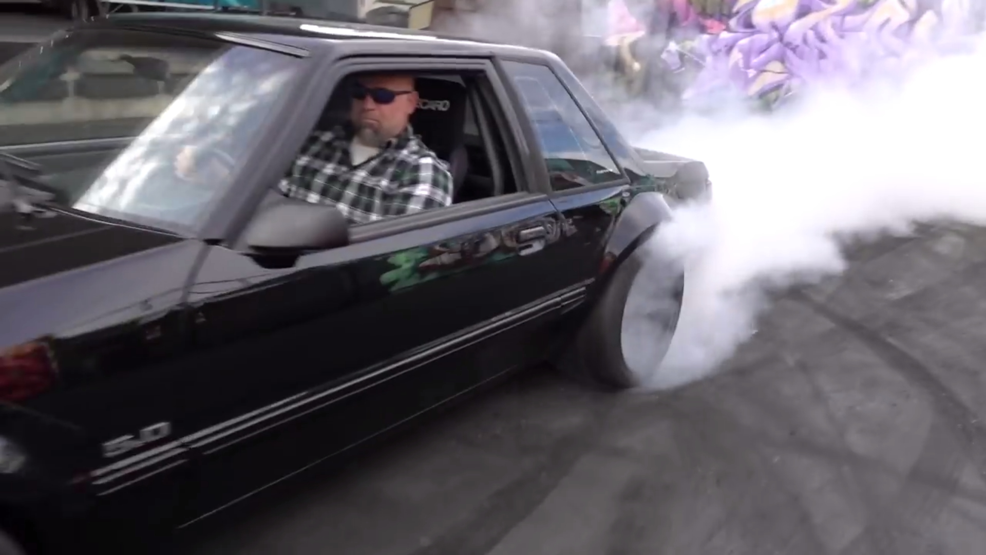 Farah knows what he’s getting into bringing a car to the Hoonigan Donut Garage—donuts or burnouts are required. He is up to the challenge, but with his Mustang’s wheels being wrapped in grippy Michelin Sport Cup 2 tires, water would be needed. He rips a solid burnout for a car with that much grip.