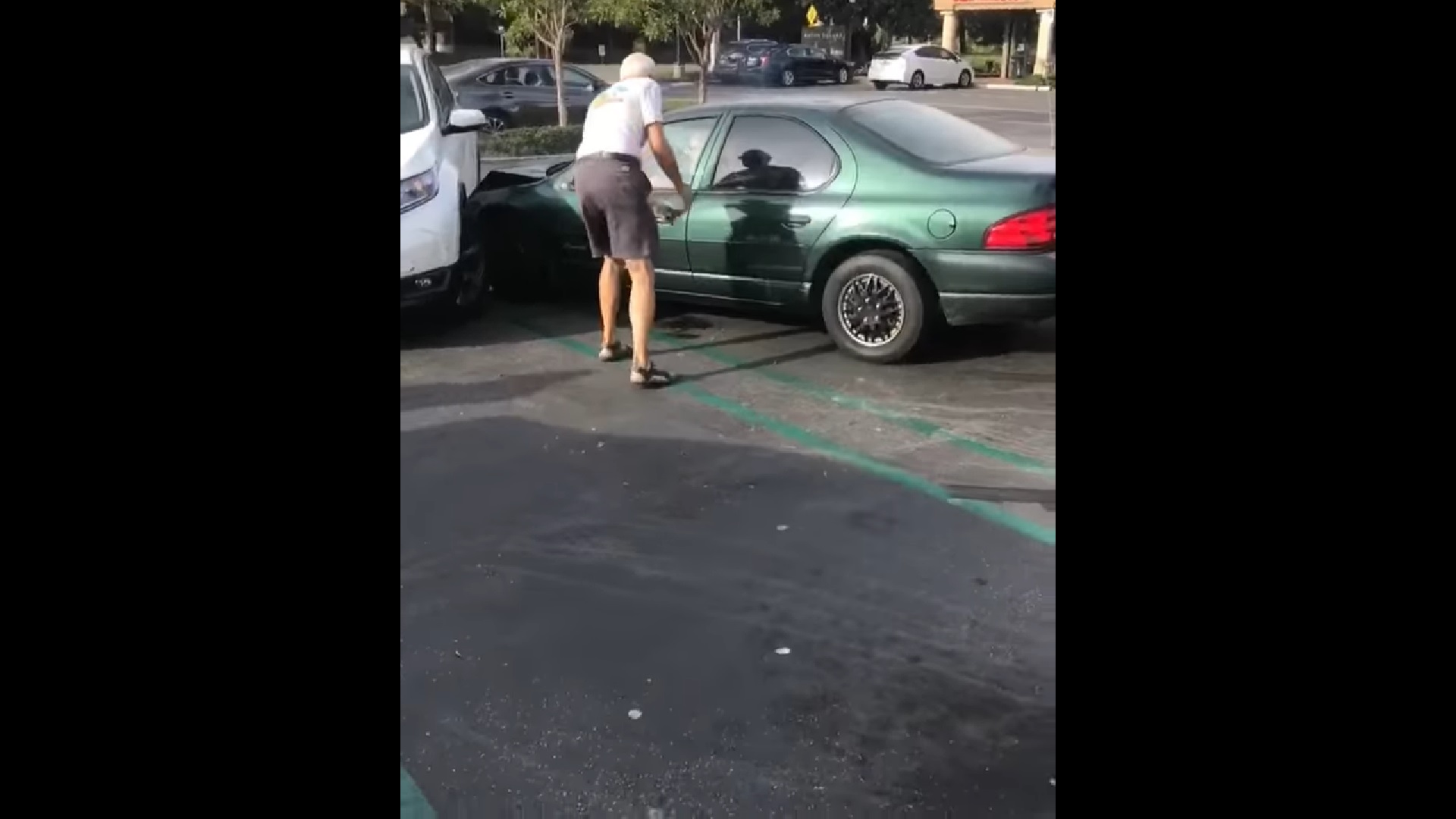 From the video’s description: “An 85-year-old woman was leaving the grocery store parking lot. While she was leaving, she put the car in drive and drove up a curb to the other side, hitting a white Honda CR-V. I heard tires screeching, looked over, and started recording. After I started recording, she put her car into reverse, backed up off the curb, and then put it into drive. She went back and forth several times and the last final time she reversed off the curb into the street. Then she put it into drive, jumped the curb, and slammed into the Honda CR-V. This finally set her airbags off. A couple rushed to her car and helped her out. She claimed the car itself went out of control, and she didn’t know what was going on. The fire department and paramedics checked her out to make sure she was okay. The DMV is now making her retake her driving test.”
