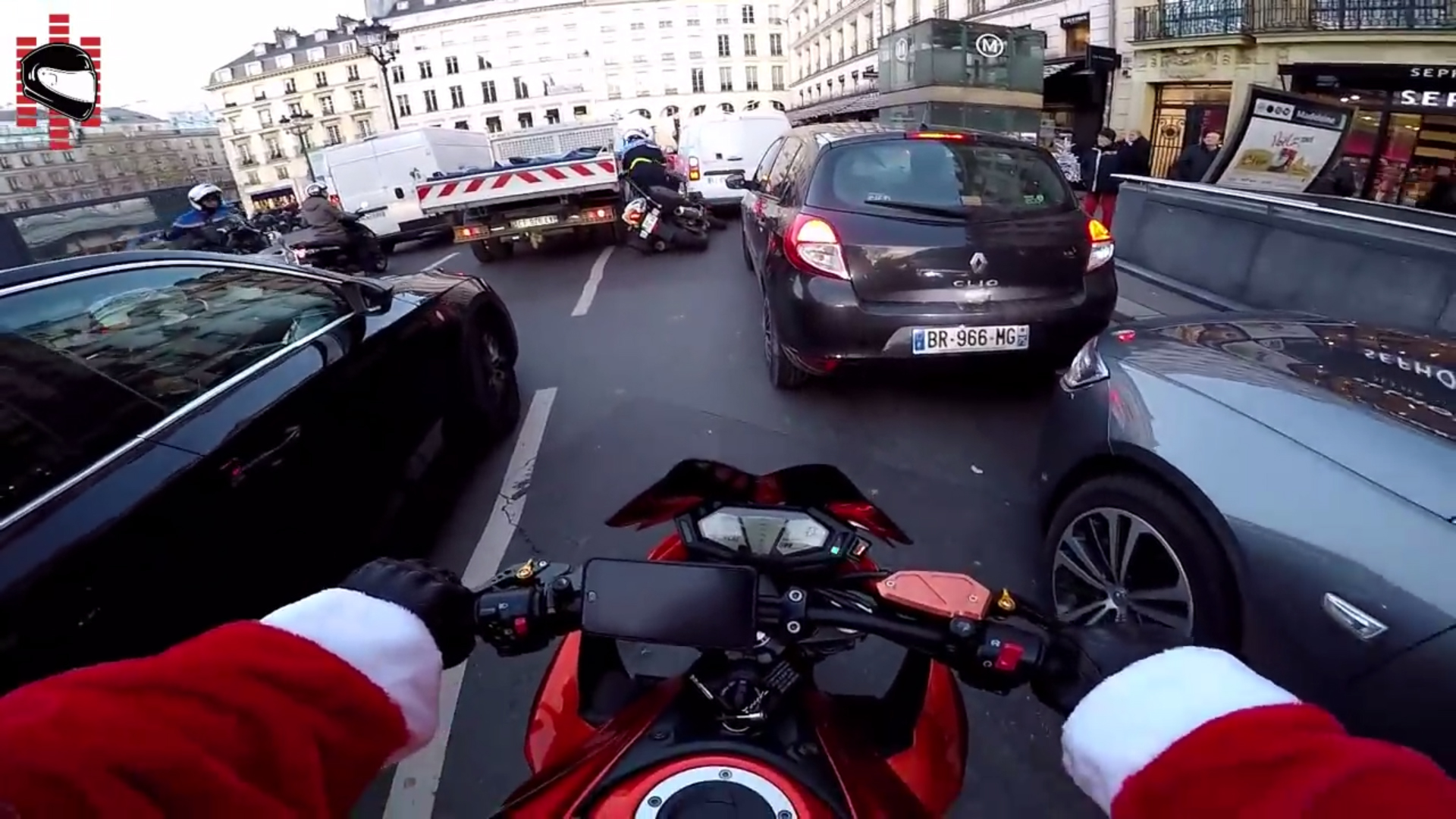 The motorcycle-mounted Santa in the first-person video is YouTuber and Kawasaki Z rider Chris RS, who was riding around Paris in the full Kris Kringle getup—beard included—to make a funny video and generally spread holiday cheer. After all, who wouldn’t love to see Santa cruising around town on a red bike?