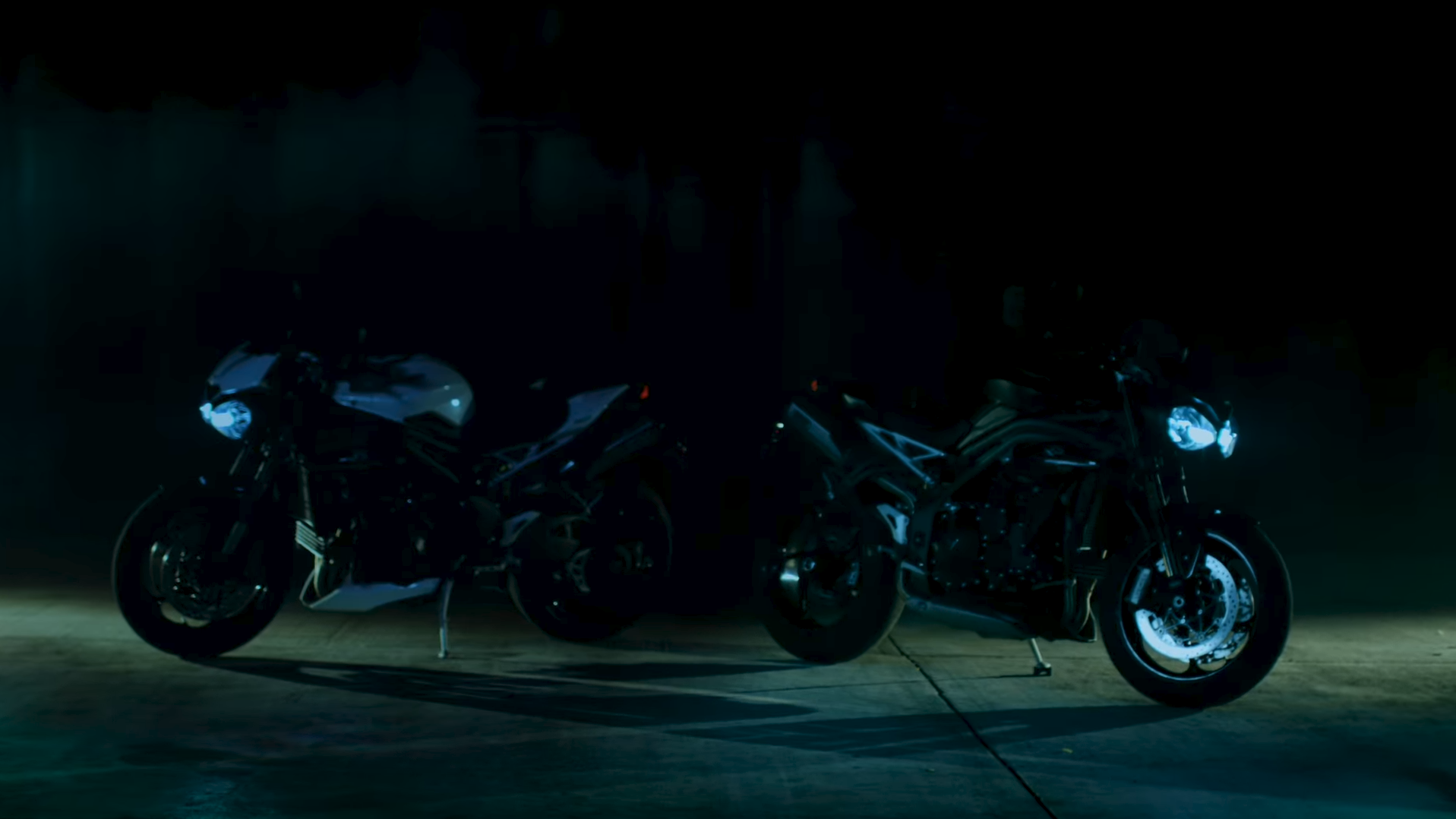 We get a good enough look at the bikes to see that they’re clearly Speed Triples thanks to the distinct bi-headlight face and overall shape. We had a feeling this was coming considering the related Street Triple just got a big update in 2017 with a bigger-displacement engine, lower weight, and three distinct models.