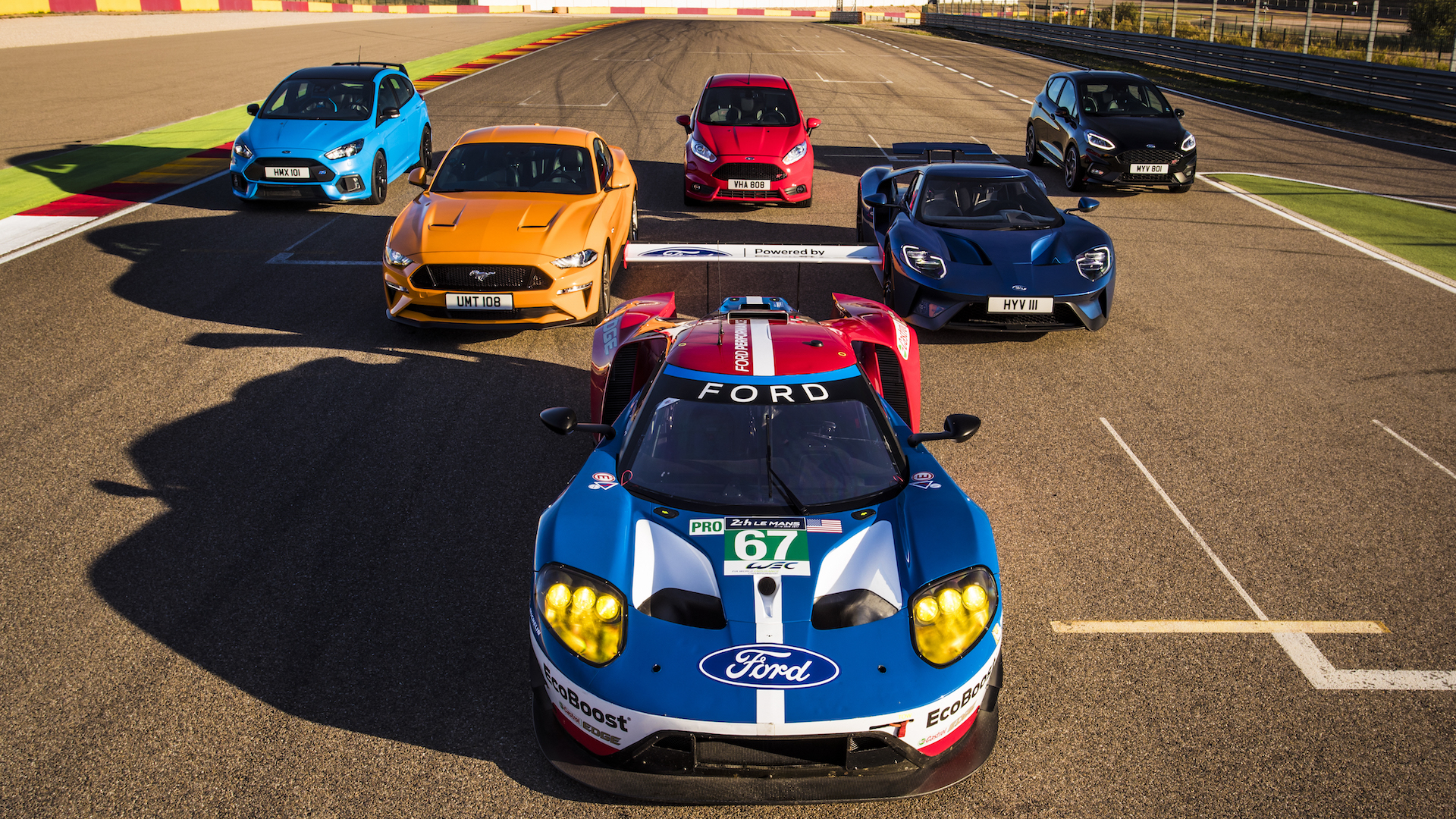 Ford managed to get together eight of its high-performance vehicles at the Motorland race circuit in Aragon, Spain, along with eight drivers from the Chip Ganassi Racing crew that competes in the World Endurance Championship, NASCAR, IndyCar, and more. The lineup of vehicles includes the F-150 Raptor, two versions of the Fiesta ST, Focus RS, Mustang GT, Shelby Mustang GT350R, Ford GT, and Ford GT race car.