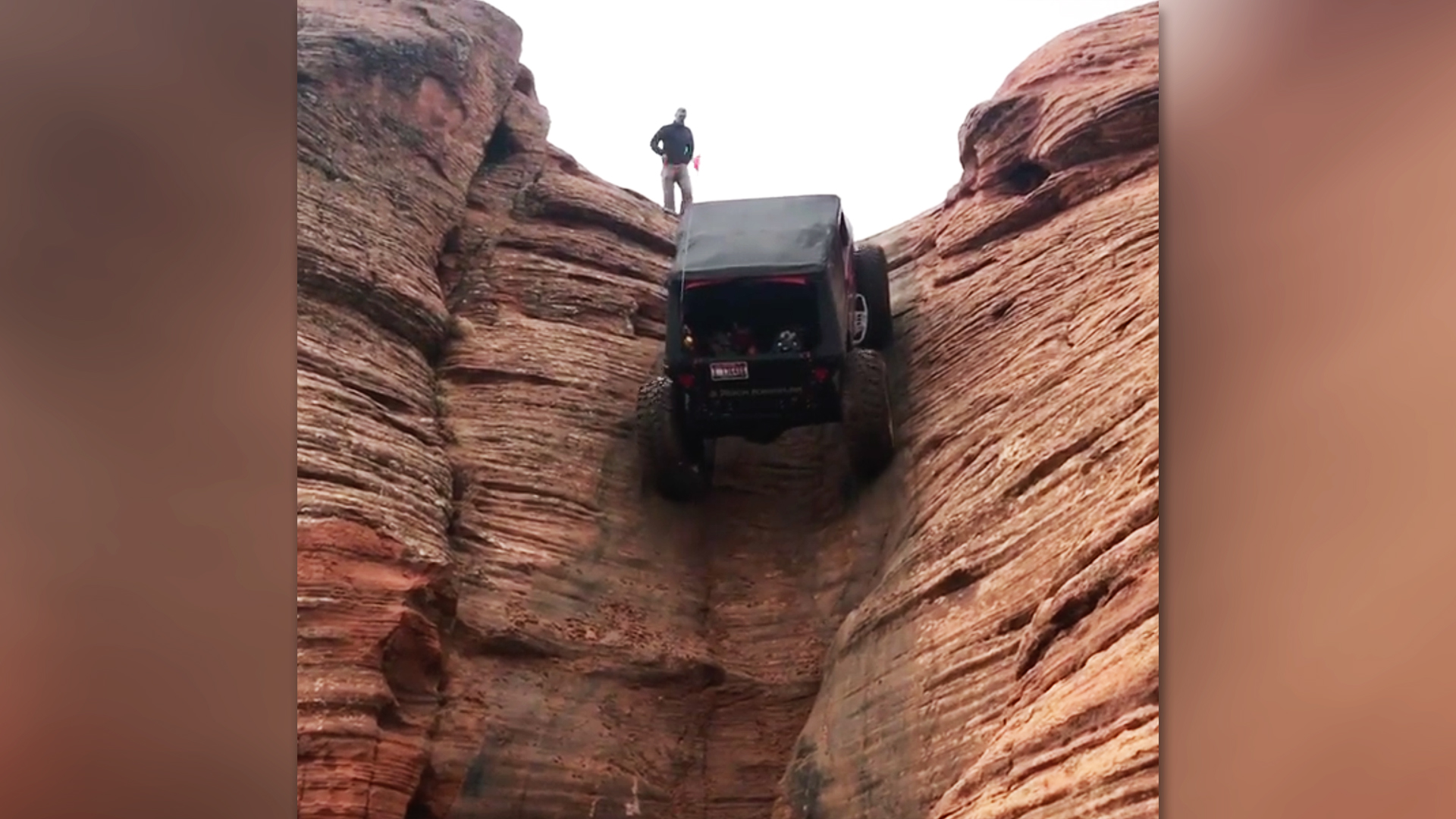 Of course, that climb is anything but easy despite the lack of drama. The surface was wet with rain—another video shows him stuck about halfway up, all four wheels slowly rotating on the damp slickrock—and even the slightest slip in that spot could trigger a disastrous rollover. This kind of stunt requires experience, extreme precision, and the kind of bravery that invites less-than-family-friendly anatomical comparisons.