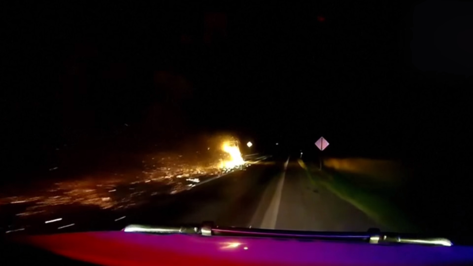 The officer turned around to pursue the mobile inferno, but the driver didn’t stop for quite some time. It is unlikely that he was trying to evade police. Rather, he probably simply didn’t see the flashing lights through the even brighter fire on the trailer. Why the driver didn’t pull over for the fire following closely behind is unknown. Perhaps it was a prototype external combustion engine? But the driver reportedly escaped unharmed and is cooperating with police.