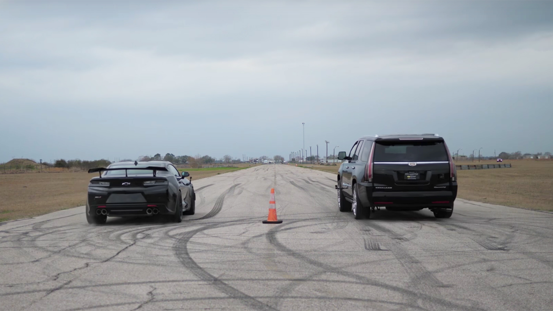 Hennessey Performance has made a name for itself by taking top-level performance cars from manufacturers and jacking up the power even further. But really, they’ll make a demon out of anything—including a black-car-special Cadillac Escalade. And this drag race shows that 805 horsepower is more than enough to make mincemeat out of some pretty stiff competition, like a quick-as-a-whip Chevy Camaro ZL1 1LE.