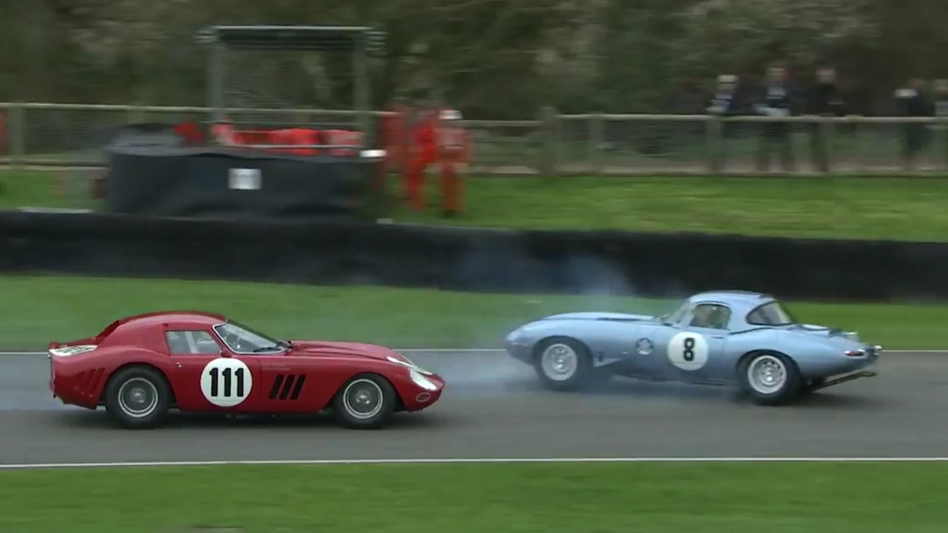Two years ago, the 73rd annual Goodwood Members Meeting played unfortunate host to one of the most cringe-worthy crashes in recent memory, when a one-off, $5.9 million 1955 Mercedes piloted by former F1 driver Jochen Mass smashed into the back of a $1.5 million 1959 Lister-Jaguar. Neither driver was injured, but man, it almost hurts to look at these pictures. So just imagine how bad it could have been if this near miss at this weekend’s Members Meeting between a 1963 Jaguar E-Type and a one-of-39 1964 Ferrari 250 GTO—worth tens of millions of dollars—had gone just a little bit more south.