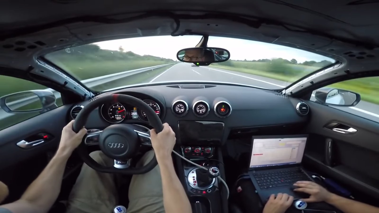 In this clip, you can see (and hear) the no-longer humble TT blast to crucial speeds with plenty of drama and excitement. There’s so much brutal exhaust noise in the car that we can’t imagine how it would sound in person. When they merge onto the Autobahn, you can hear the sharp downshift from the DSG transmission, letting out a romp of revs and turbo whistle. As the car builds boost, the car gains speed drastically. You can see the tachometer bounce far past redline, promising a good time when loaded down with throttle.