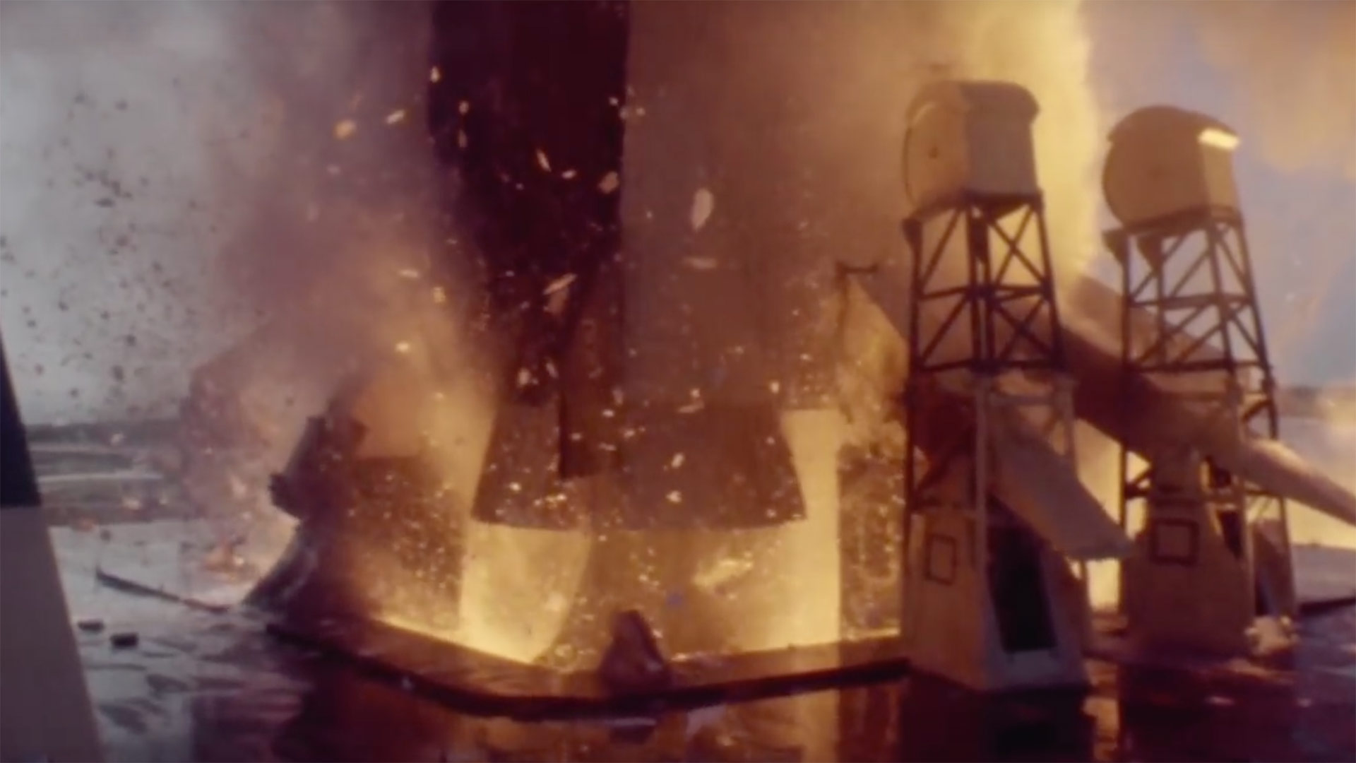 Towards the second half of the video, the launch pad turns into a fiery hell that scientists desperately try to cool down with an ocean of water, but for the first few minutes (seconds) the water is instantly turned to steam. If you have to time, we suggest you roll through this video once or twice.