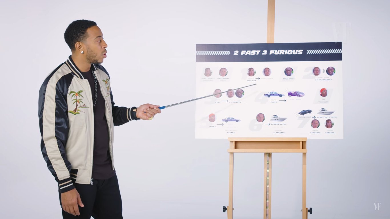 This past weekend, we were finally graced with the release of The Fate of the Furious, the eighth (!) installment of Vin Diesel’s nitrous-fueled race opera. With its leap-frogging timeline and ever-shifting allegiances, the story of Dominic Toretto, Brian O’Conner, and the rest of the Family can be a lot to keep track of. Lucky for you, Vanity Fair got rapper and Fast and Furious star Chris “Ludacris” Bridges to give us a SparkNotes-style recap of the entire saga, from the 2001 original all the way to 2015’s car-skydiving