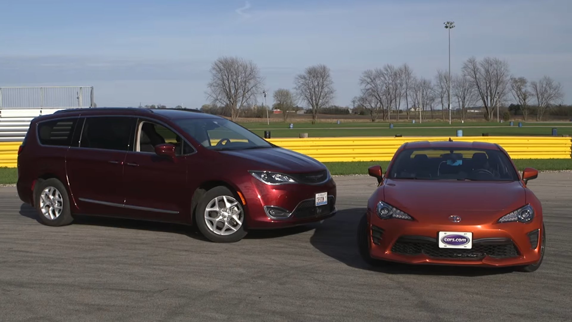 Before we get to the results, let’s start with the raw numbers for both cars. In the red corner, weighing 2,754 pounds and equipped with a six-speed automatic transmission, the new Toyota 86 puts out about 200 horsepower and 151 foot-pounds of torque, all directed to the rear wheels. And in the blue corner, the Chrysler Pacifica clocks in at a hefty 4,330 pounds and rocks a nine-speed gearbox, while recording a respectable 287 hp and 262 lb-ft of torque from its 3.6-liter V6 powering the front wheels.